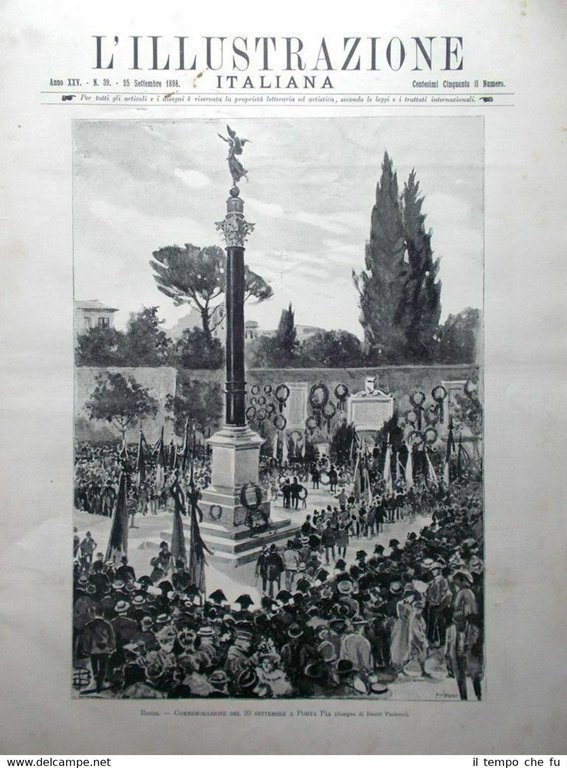 L'Illustrazione Italiana Rivista originale del 25 Settembre 1898 Anno 25 - N. 39 Rarità per appassionati e collezionisti Segue sotto solamente un saggio del ricco contenuto presente Illustrato in copertina (segue foto): Roma: commemorazione del 20 settembre a Porta Pia Illustrazione presente nelle pagine interne (segue foto): Vienna: i funerali dell'imperatrice Elisabetta Altra Illustrazione presente nelle pagine interne (segue foto): Napoli: la festa di Piedigrotta Tra gli argomenti trattati e le notizie contenute: Ricordi di Porto d'Anzio Canrobert, l'ultimo dei marescialli di Francia I drammi dell'alpinismo La cattedrale di Vienna Una conversazione tra Verga e Rod Montefiascone e il suo nuovo acquedotto publico Le autorità e il comitato per l'acquedotto Umberto I .e tanto altro ancora! Qualora vogliate maggiori delucidazioni contattateci. In questo negozio troverai un'intera categoria dedicata alla collezione dell'Illustrazione Italiana , ne inseriamo diverse giornalmente. Sotto il link diretto a tutta la collezione: Riviste disponibili Cliccaci sopra, troverai di certo ciò che cerchi! L'illustrazione Italiana è stata una rivista settimanale italiana con sede a Milano, pubblicata ininterrottamente dal 1873 al 1962 per un totale di quasi 5 000 numeri. Fondata a Milano con la testata «Nuova illustrazione universale», fu edita dalla casa editrice Fratelli Treves, fondata da Emilio Treves, il quale fu anche il primo direttore della rivista. L'illustrazione italiana comincia ad avere un'ampia diffusione negli ambienti della medio-alta borghesia, grazie alla qualità degli articoli e soprattutto delle illustrazioni, spesso affidate ad artisti di primo piano come Achille Beltrame, Pietro Scoppetta, Luigi Bompard, Giuseppe Cosenza ed Ettore Ximenes (il quale svolgeva anche le funzioni di vicedirettore), tale qualità fu mantenuta poi nel tempo anche in seguito all'avvento della fotografia, tecnica che vide rappresentati sulle pagine dell'«Illustrazione» alcuni tra i migliori fotogiornalisti nazionali: Armando Bruni, Mario Crimella, Giulio Parisio ed Emilio Sommariva. Per i testi il periodico si avvalse della collaborazione, in qualità di articolisti, di alcuni dei nomi più importanti della letteratura italiana, fra cui ricordiamo Giosuè Carducci, Grazia Deledda e Luigi Pirandello (premi Nobel per la letteratura), lo scrittore verista Giovanni Verga, il poeta Gabriele D'Annunzio, il critico letterario e favolista Luigi Capuana ed Edmondo De Amicis, autore del celeberrimo romanzo "Cuore", capolavoro della letteratura per ragazzi. La grande fortuna dell'Illustrazione Italiana durò fino alla morte di Emilio Treves (1916), dopo la quale, pur avendo ancora tra i propri collaboratori scrittori del calibro di Eugenio Montale, Elio Vittorini, Salvatore Quasimodo, Riccardo Bacchelli, Italo Pietra, Niccolò Giani e Sergio Solmi, la rivista cominciò a mostrare i segni di un lento declino. La promulgazione delle leggi razziali fasciste accelerò il processo in atto: nel 1939 la Treves dovette cedere l'azienda alla Garzanti. Verso la metà del 1942, in seguito agli eventi della seconda guerra mondiale, L'illustrazione rallentò le sue uscite, fino ad essere trasformata in mensile nel 1951 da Livio Garzanti. Gli anni cinquanta videro la crescita vertiginosa dei rotocalchi, settimanali popolari di attualità. «L'Illustrazione Italiana» vide ridursi progressivamente il suo spazio, finché Garzanti la chiuse nel 1962. L'editore Guanda riprese la testata alla fine del 1981 e la ripubblicò con periodicità bimestrale. Il tentativo non incontrò sufficiente fortuna e la rivista fu chiusa nel 1996. Paypal Carta di credito Bonifico bancario Spedizione con posta ordinaria o raccomandata scelta dall'Acquirente nel momento del pagamento