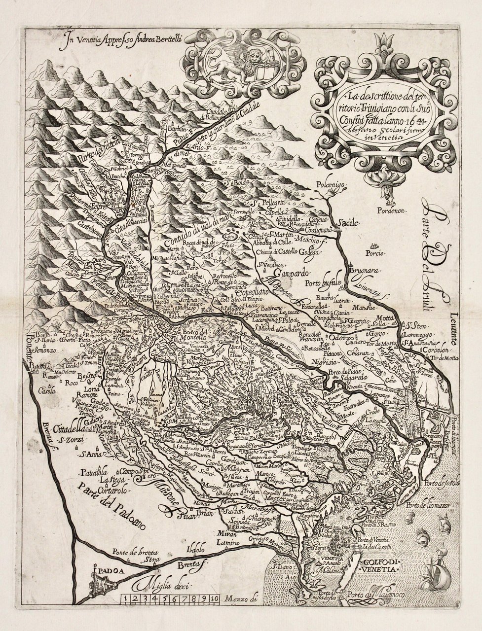 Acquaforte e bulino, mm 336x262, impressa su carta vergata priva di filigrana. Esemplare in perfetto stato di conservazione con pieni margini assai ampi. Stato IV/IV con l'indirizzo aggiunto "Stefano Scolari forma in Venetia" nel cartiglio sotto al titolo in alto a destra, mentre in alto a sinistra resta l'indirizzo di Bertelli "In Venetia Appresso Andrea Bertelli". In alto al centro un leone marciano entro cartiglio domina il territorio. In basso appare una scala di miglia 10. La carta di Bertelli è chiaramente derivata dall'opera di Paolo Rover, basata sul manoscritto di Giovanni Pinadello, di cui è una esatta replica ed è rarissima, essendone conosciuto solo un esemplare alla Vaticana. Presenta la data 1601 visibilmente corretta, tanto da far presupporre una tiratura precedente, che Almagià suppone sia il 1591. Esiste un terzo stato pubblicato da Bertelli nel 1604. Marinelli registra anche questo stato di Scolari conoscendone un esemplare nella biblioteca del Conte Agosti a Belluno, mentre un altro esemplare è stato rintracciato in una raccolta fattizia alla Marciana.<BR>Marinelli (1881), n. 743; Tooley (1983), 553b; Bifolco-Ronca, Cartografia e topografia italiana del XVI secolo, tav. 966 <BR>