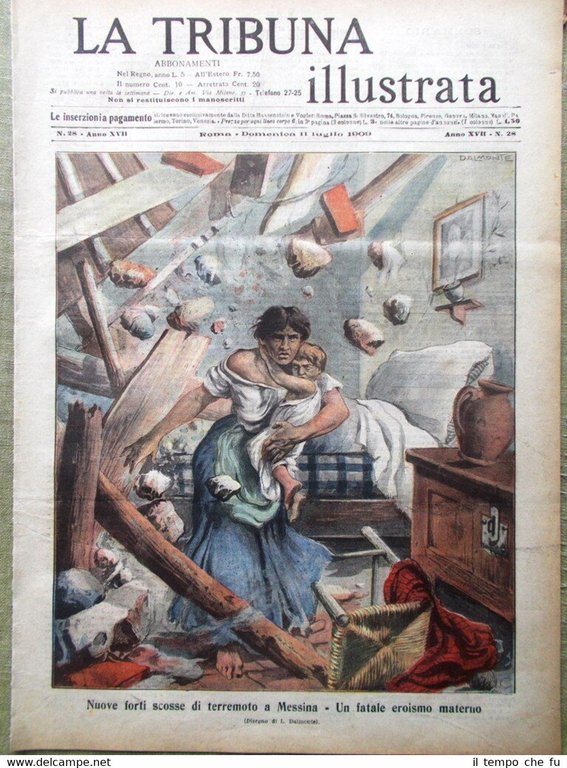 La Tribuna Illustrata Rivista originale del 11 Luglio 1909 Anno 17 - N. 28 Rarità per appassionati e collezionisti Seguono solo alcuni dei fatti descritti, illustrati e fotografati all'interno Illustrato in copertina (segue foto): Nuove forti scosse di terremoto a Messina: un fatale eroismo materno (disegno di Dalmonte) Illustrato nella retro copertina (segue foto): La guerra civile in Persia: uno scontro notturno fra rivoluzionari e truppe dello Scià (disegno di Dalmonte) Nelle pagine interne: I congressisti delle Camere di commercio a Terni. La crociera motonautica sul Po. Che cos'è lo spiritismo ? La ginnastica dei ciechi. Il nuovo manicomio di Roma. Il circuito aereo di Brescia. .e tanto altro ancora! Qualora vogliate maggiori delucidazioni contattateci In questo negozio troverai un'intera categoria dedicata alle Tribune Illustrate, sotto il link diretto alla collezione: Riviste disponibili Cliccaci sopra, troverai di certo ciò che cerchi! La Tribuna Illustrata fu un settimanale italiano pubblicato a Roma. Insieme a La Domenica del Corriere e a L'Illustrazione Italiana fu il settimanale illustrato preferito dagli Italiani nel periodo che intercorse dalla fine dell'800 all'avvento della televisione. Fondato nel 1890 come supplemento del quotidiano La Tribuna, il primo numero uscì il 6 gennaio, il formato della rivista era cm 27 x 38, un formato poco più grande del tabloid. La prima ed ultima pagina erano a colori, disegnate da pittori e incisori affermati. Ogni numero conteneva 16 pagine. I principali collaboratori furono: Luigi Capuana, Adolfo De Bosis, Alfredo Fabrizi, Gandolin, Giuseppe Giacosa, Attilio Luzzato, Enrico Panzacchi, Rastignac, Attilio Sarfatti, Armand Silvestre, Ettore Socci, Gaspare Ungarelli, Pio Vanzi, Annie Vivanti. Il Corredo iconografico fu di prim'ordine. I principali pittori, disegnatori ed illustratori furono: Basilio Cascella e i figli Tommaso e Michele, Enrico Lionne, Aleardo Terzi, Augusto Bompiani, Roberto Bompiani, Domenico Bruschi, Modesto Faustini, Rubens Santoro, Rafael Senet, Cesare Tiratelli. Tra i romanzi a puntate che vi uscirono ricordiamo: L'invincibile, di Gabriele D'Annunzio Una giovinezza, di Francois Coppée e Zia Aurelia di André Theuriet, questi ultimi due entrambi illustrati da Emile Bayard. Paypal Carta di credito Bonifico bancario Spedizione con posta prioritaria o raccomandata scelta dall'acquirente nel momento del pagamento