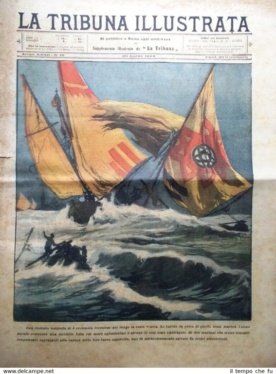 La Tribuna Illustrata Rivista originale del 20 Aprile 1924 Anno 32 - N. 16 Rarità per appassionati e collezionisti Seguono solo alcuni dei fatti descritti, illustrati e fotografati all'interno Illustrato in copertina (segue foto): Una violenta tempesta si è scatenata recentemente lungo la costa veneta con alcune barche naufragate Illustrato nella retro copertina (segue foto): Un grosso orangutan fuggito dalla gabbia in cui era rinchiuso, sopra un veliero navigante presso l'arcipelago della Sonda e addetto al trasporto di belve, raggiunse improvvisamente un marinaio sulla cime di uno degli alberi e lo precipitò in mare (disegno di A. Minardi) Nelle pagine interne: Come parleremo con Marte Il principe ereditario Umberto assiste alla caccia della volpe. La proclamazione della repubblica greca. Il pugile Georges Carpentier. Partite di polo sui ghiacci norvegesi a bordo di side-car. Il generale Ludendorff a Monaco. Corsa automobilistica a Los Angeles. .e tanto altro ancora! Qualora vogliate maggiori delucidazioni contattateci In questo negozio troverai un'intera categoria dedicata alle Tribune Illustrate, sotto il link diretto alla collezione: Riviste disponibili Cliccaci sopra, troverai di certo ciò che cerchi! La Tribuna Illustrata fu un settimanale italiano pubblicato a Roma. Insieme a La Domenica del Corriere e a L'Illustrazione Italiana fu il settimanale illustrato preferito dagli Italiani nel periodo che intercorse dalla fine dell'800 all'avvento della televisione. Fondato nel 1890 come supplemento del quotidiano La Tribuna, il primo numero uscì il 6 gennaio, il formato della rivista era cm 27 x 38, un formato poco più grande del tabloid. La prima ed ultima pagina erano a colori, disegnate da pittori e incisori affermati. Ogni numero conteneva 16 pagine. I principali collaboratori furono: Luigi Capuana, Adolfo De Bosis, Alfredo Fabrizi, Gandolin, Giuseppe Giacosa, Attilio Luzzato, Enrico Panzacchi, Rastignac, Attilio Sarfatti, Armand Silvestre, Ettore Socci, Gaspare Ungarelli, Pio Vanzi, Annie Vivanti. Il Corredo iconografico fu di prim'ordine. I principali pittori, disegnatori ed illustratori furono: Basilio Cascella e i figli Tommaso e Michele, Enrico Lionne, Aleardo Terzi, Augusto Bompiani, Roberto Bompiani, Domenico Bruschi, Modesto Faustini, Rubens Santoro, Rafael Senet, Cesare Tiratelli. Tra i romanzi a puntate che vi uscirono ricordiamo: L'invincibile, di Gabriele D'Annunzio Una giovinezza, di Francois Coppée e Zia Aurelia di André Theuriet, questi ultimi due entrambi illustrati da Emile Bayard. Paypal Carta di credito Bonifico bancario Spedizione con posta prioritaria o raccomandata scelta dall'acquirente nel momento del pagamento