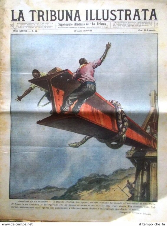 La Tribuna Illustrata Rivista originale del 20 Aprile 1930 Anno 38 - N. 16 Rarità per appassionati e collezionisti Seguono solo alcuni dei fatti descritti, illustrati e fotografati all'interno Illustrato in copertina (segue foto): A Baroda (India), due operai, mentre stavano lavorando all'estremità di una trave di ferro in un cantiere, si accorgevano che un grosso serpente si era avvolto alla trave stessa. Per fortuna, dato l'allarme, accorrevano altri operai che riuscivano a liberare senza danno i malcapitati uccidendo il rettile (disegno di Vittorio Pisani) Illustrato nella retro copertina (segue foto): Alcuni zingari in una fattoria presso Lodz (Varsavia) aggredivano, ferendolo, il figlio del proprietario. Tuttavia il ragazzo riusciva a montare in sella e, poiché gli zingari lo inseguivano, sparava contro di loro uccidendone due e ferendone altri due (disegno di Vittorio Pisani) Nelle pagine interne: Lita Grey: Charlot cattivo marito, ma. Il Re visita a Civitavecchia gli impianti per la conservazione del pesce. I bassifondi di New York. I principi Umberto e Maria di Piemonte alla stazione per la partenza della Regina del Belgio. .e tanto altro ancora! Qualora vogliate maggiori delucidazioni contattateci In questo negozio troverai un'intera categoria dedicata alle Tribune Illustrate, sotto il link diretto alla collezione: Riviste disponibili Cliccaci sopra, troverai di certo ciò che cerchi! La Tribuna Illustrata fu un settimanale italiano pubblicato a Roma. Insieme a La Domenica del Corriere e a L'Illustrazione Italiana fu il settimanale illustrato preferito dagli Italiani nel periodo che intercorse dalla fine dell'800 all'avvento della televisione. Fondato nel 1890 come supplemento del quotidiano La Tribuna, il primo numero uscì il 6 gennaio, il formato della rivista era cm 27 x 38, un formato poco più grande del tabloid. La prima ed ultima pagina erano a colori, disegnate da pittori e incisori affermati. Ogni numero conteneva 16 pagine. I principali collaboratori furono: Luigi Capuana, Adolfo De Bosis, Alfredo Fabrizi, Gandolin, Giuseppe Giacosa, Attilio Luzzato, Enrico Panzacchi, Rastignac, Attilio Sarfatti, Armand Silvestre, Ettore Socci, Gaspare Ungarelli, Pio Vanzi, Annie Vivanti. Il Corredo iconografico fu di prim'ordine. I principali pittori, disegnatori ed illustratori furono: Basilio Cascella e i figli Tommaso e Michele, Enrico Lionne, Aleardo Terzi, Augusto Bompiani, Roberto Bompiani, Domenico Bruschi, Modesto Faustini, Rubens Santoro, Rafael Senet, Cesare Tiratelli. Tra i romanzi a puntate che vi uscirono ricordiamo: L'invincibile, di Gabriele D'Annunzio Una giovinezza, di Francois Coppée e Zia Aurelia di André Theuriet, questi ultimi due entrambi illustrati da Emile Bayard. Paypal Carta di credito Bonifico bancario Spedizione con posta prioritaria o raccomandata scelta dall'acquirente nel momento del pagamento