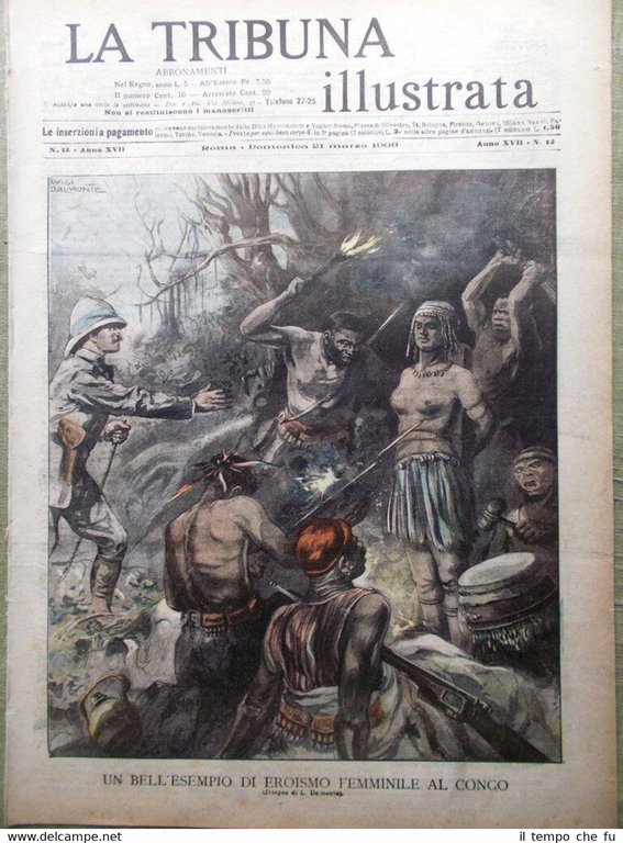 La Tribuna Illustrata Rivista originale del 21 Marzo 1909 Anno 17 - N. 12 Rarità per appassionati e collezionisti Seguono solo alcuni dei fatti descritti, illustrati e fotografati all'interno Illustrato in copertina (segue foto): Un bell'esempio di eroismo femminile al Congo (disegno di Dalmonte) Illustrato nella retro copertina (segue foto): Una battaglia fra arabi, armeni e soldati turchi nel palazzo di giustizia a Costantinopoli (disegno di Dalmonte) Nelle pagine interne: Don Romolo Murri, il primo sacerdote deputato. Fra le baracche calabro-sicule, il ritorno alla vita. La nuova camera dei deputati per la 23^ legislatura. Prediche e quaresimali. .e tanto altro ancora! Qualora vogliate maggiori delucidazioni contattateci In questo negozio troverai un'intera categoria dedicata alle Tribune Illustrate, sotto il link diretto alla collezione: Riviste disponibili Cliccaci sopra, troverai di certo ciò che cerchi! La Tribuna Illustrata fu un settimanale italiano pubblicato a Roma. Insieme a La Domenica del Corriere e a L'Illustrazione Italiana fu il settimanale illustrato preferito dagli Italiani nel periodo che intercorse dalla fine dell'800 all'avvento della televisione. Fondato nel 1890 come supplemento del quotidiano La Tribuna, il primo numero uscì il 6 gennaio, il formato della rivista era cm 27 x 38, un formato poco più grande del tabloid. La prima ed ultima pagina erano a colori, disegnate da pittori e incisori affermati. Ogni numero conteneva 16 pagine. I principali collaboratori furono: Luigi Capuana, Adolfo De Bosis, Alfredo Fabrizi, Gandolin, Giuseppe Giacosa, Attilio Luzzato, Enrico Panzacchi, Rastignac, Attilio Sarfatti, Armand Silvestre, Ettore Socci, Gaspare Ungarelli, Pio Vanzi, Annie Vivanti. Il Corredo iconografico fu di prim'ordine. I principali pittori, disegnatori ed illustratori furono: Basilio Cascella e i figli Tommaso e Michele, Enrico Lionne, Aleardo Terzi, Augusto Bompiani, Roberto Bompiani, Domenico Bruschi, Modesto Faustini, Rubens Santoro, Rafael Senet, Cesare Tiratelli. Tra i romanzi a puntate che vi uscirono ricordiamo: L'invincibile, di Gabriele D'Annunzio Una giovinezza, di Francois Coppée e Zia Aurelia di André Theuriet, questi ultimi due entrambi illustrati da Emile Bayard. Paypal Carta di credito Bonifico bancario Spedizione con posta prioritaria o raccomandata scelta dall'acquirente nel momento del pagamento