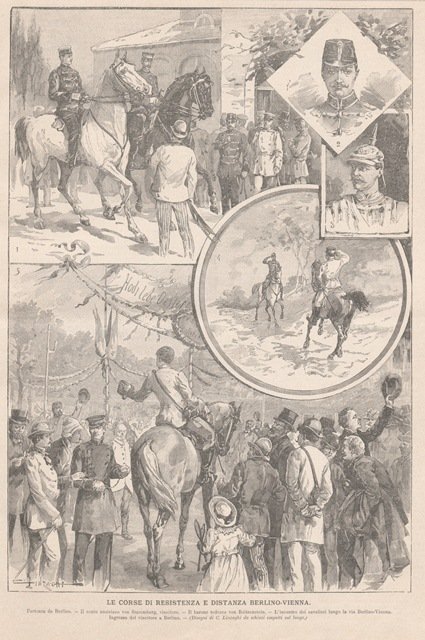 Composizione di cinque vignette: Partenza da Berlino - Il conte austriaco von Staremberg, vincitore - Il barone tedesco von Reitzenstein - L’incontro dei caavalieri lungo la via Berlino-Vienna - Ingresso del vincitore a Berlino.Testo al retro