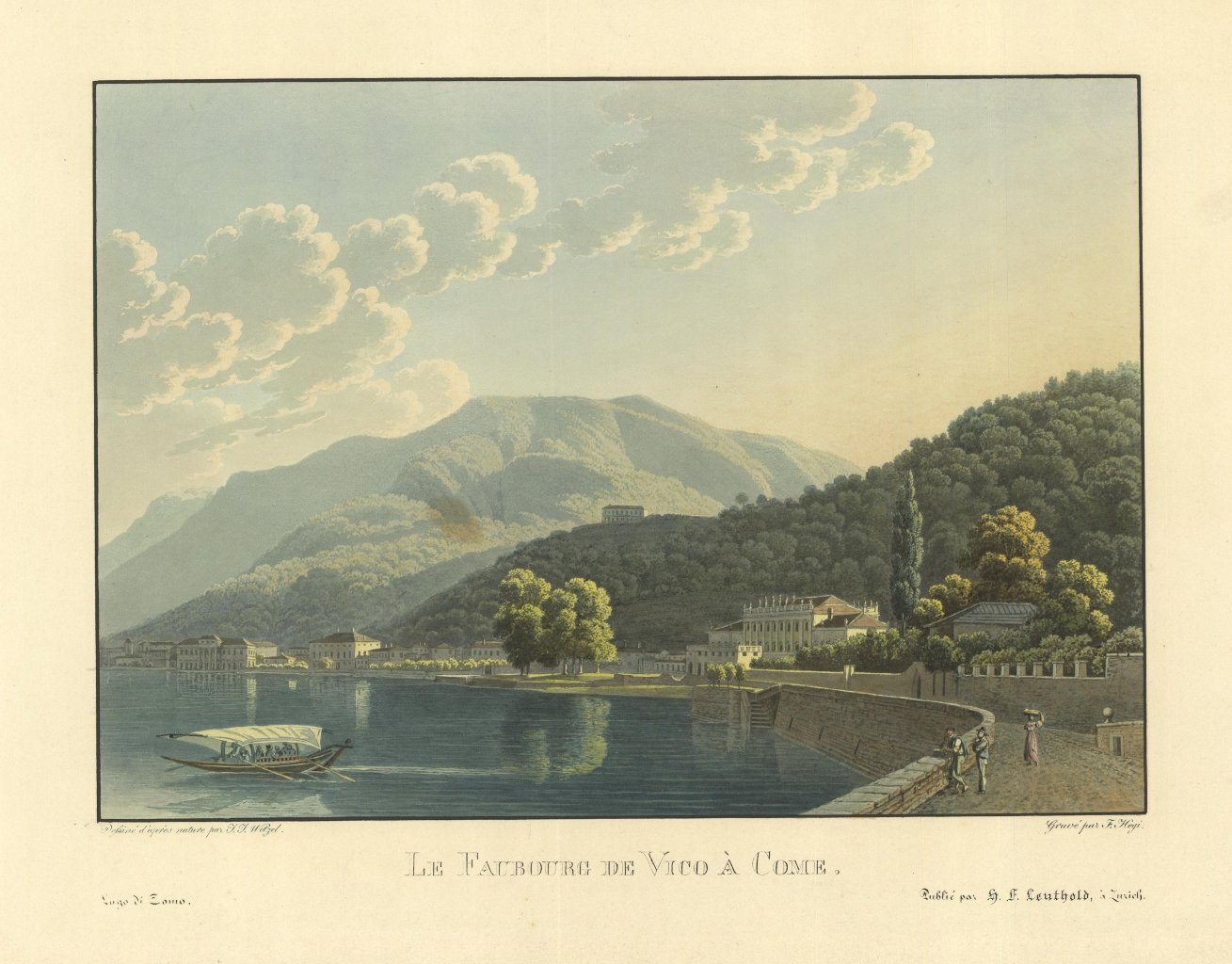 Veduta del quartiere di Borgo Vico, nei pressi di Como, lungo la sponda occidentale. La scena è ripresa verso le ultime ore del giorno dalla la strada che portava a Cernobbio. "Le faubourg Vico à Come est généralement connu par sa situation agréable au bord du lac et par le nombre considérable se ses édifices élégans." *. Sulla destra la prestigiosa Villa Raimondi, oggi Villa Olmo, mentre proseguendo con lo sguardo lungo la riva si riconoscono la Villa Gallia e la Battaglia, mentre in fine, all'estrema sinistra, si scorge il profilo del campanile della Chiesa di S. Giorgio. Rara edizione, non menzionata nella bibliografia di riferimento, che riporta l'indicazione editoriale di Hans Felix Leuthold. Piccola macchia che non compromette l'ottimo stato di conservazione generale. * "Voyage Pittoresque au Lac de Como"