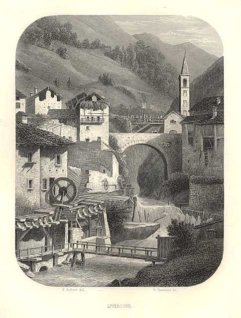 Stampa antica ed originale con veduta del centro del paese visto dal torrente. Tratta dall'opera " La Vallée d'Aoste " stampata a Parigi da Amyot. Autore: Aubert E. del. - E. Chavanne sc. Luogo: Valle d'Aosta. Anno: 1860. Tecnica: incisione in acciaio. Dimensioni: 188x144 mm