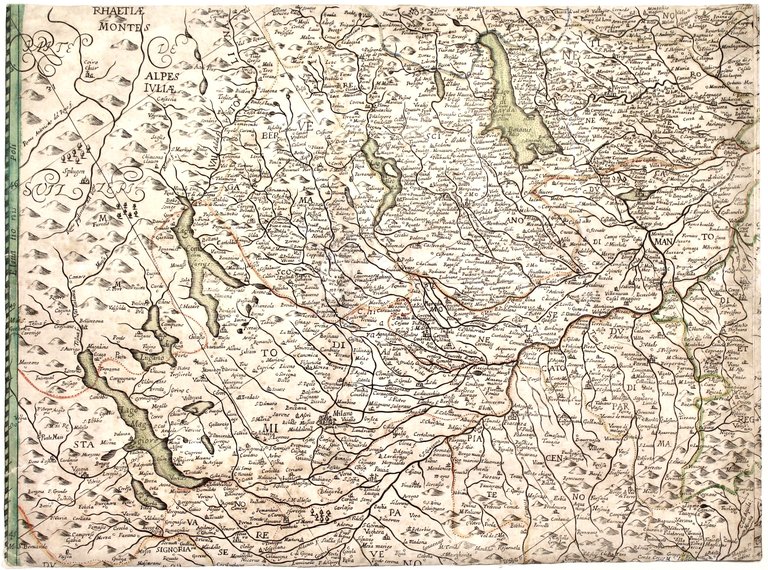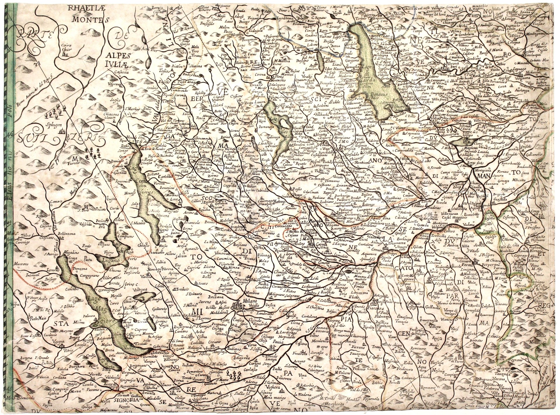 Edizione non identificata della fine del XVII secolo. Incisione in rame, mm 380x520, dipinta a mano. Foglio centrale sinistro raffigurante tutta la Lombardia, il Veronese e il Ducato di Parma e Piacenza. Tratta da un'edizione non identificata della grande carta dell'Italia di Matteo Greuter, che consta di 12 fogli. Fu pubblicata inizialmente a Roma dal 1630 ma nota solo in edizioni del 1640, 1647 e 1695, nonché in due repliche pubblicate a Venezia da Scolari nel 1657 e a Bologna da Longhi e Todeschi nel 1675 e 1713. Tutte le edizioni sono assai rare, note in pochi esemplari nelle biblioteche europee e nelle collezioni private. Nato a Strasburgo nel 1556, Matteo Greuter lavora a Lione, Avignone e Roma. Si distingue per una tecnica raffinata ed elegante, che trova la sua massima espressione in questa bella carta dell'Italia in 12 fogli, la più grande fino ad allora pubblicata. Buon esemplare con un restauro integrativo nella zona di Bergamo-Ponte San Pietro.
