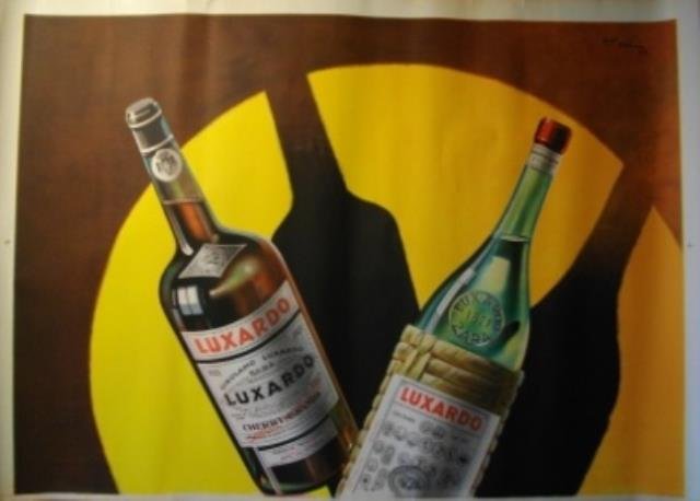 Arti Grafiche Navarra S. A. Milano, 1938 – XVI. Stampa in litografia in colore con stampa in offset, cm 140 X 100. Si tratta della sola metà superiore del manifesto (ma disponiamo anche dell'intero manifesto), su disegno del veneziano Alessandro Pomi (firmato e datato A. Pomi XVI nell'angolo superiore in alto a destra, sulla metà del foglio superiore). L'immagine mostra due bottiglie su fondo nero inserite entro cerchio giallo e arancione su cui si stagliano le ombre nere delle due; molto ben leggibile è l'etichetta di entrambe. Si tratta del solo foglio superiore dei due di cui si compone il manifesto, recante la firma dell'Autore e la data, e che comunque chiude anche indipendentemente dalla metà inferiore del foglio (che lo completa con la scritta Luxardo Zara), considerato il margine bianco. Alcuni normali strappi marginali ma a pieni margini (non visibili nella foto), buone condizioni. .
