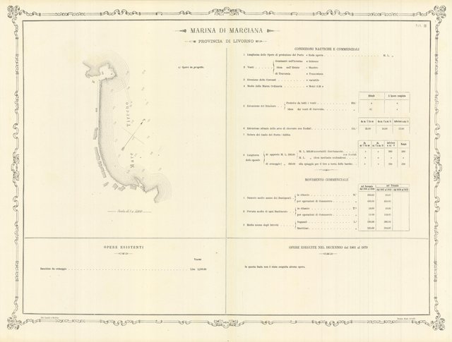 Raffigurazione planimetrica del porto accompagnata da descrizione statistica riguardante: condizioni nautiche e commerciali, movimento commerciale, opere esistenti e opere eseguite tra il 1861 ed il 1870, dopo la costituzione del Regno d'Italia. Il tutto racchiuso in decorativa cornice