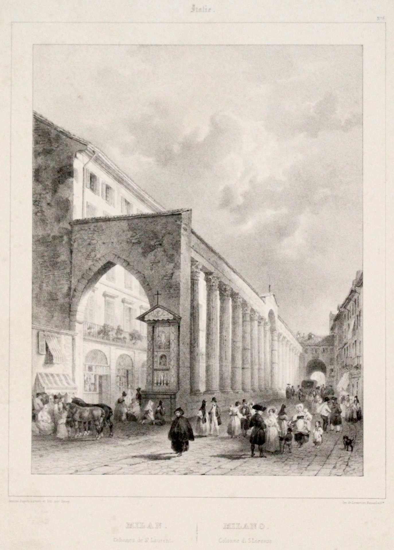 Litografia, mm 230x175 (l'immagine), pubblicata da Lemercier. Suggestivo scorcio lungo le colonne Buon esemplare.