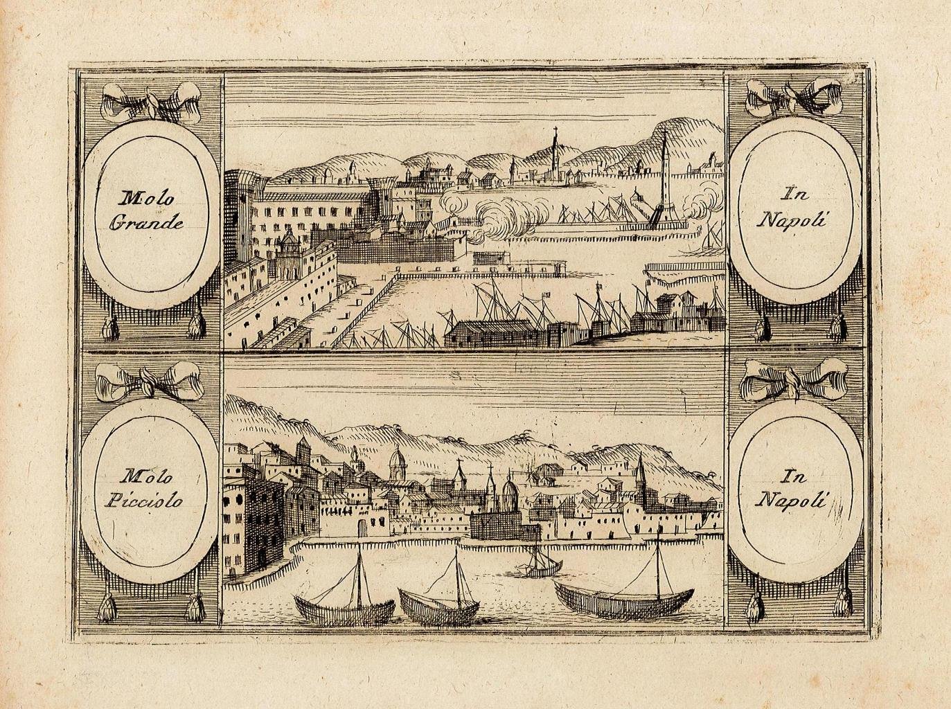 Rara veduta con due scorci della città di Napoli inserita nell’opera “Teatro della Guerra. - Regno di Napol” del cosmografo veneziano Vincenzo Maria Coronelli edita a Venezia nel 1707-1708