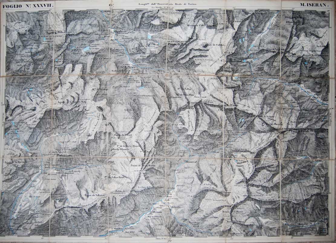 Carta geografica (cm. 54 x 73), montata su tela, divisa in 18 riquadri e ripiegata, raffigurante il territorio francese della Val d'Isère. Costituisce il foglio XXXVII.Contenuta in una custodia edit. in tela (di cm. 19x12,8), è ben conservata.