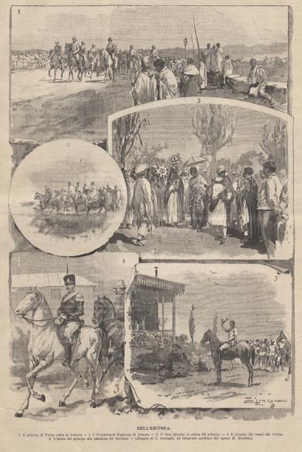Insieme di cinque vignette: 1. Il principe di Torino entra in Asmara - 2. Il Commissario Regionale di Asmara - 3. Il clero abissino in attesa del principe - 4. Il principe che recasi alla rivista - 5. L’arrivo del principe alla palazzina del Governo. Testo al retro