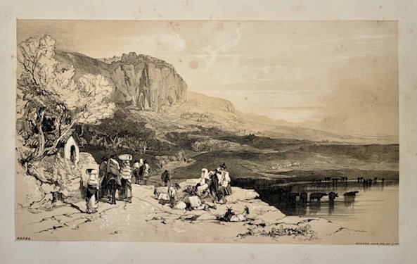 Litografia originale in tonalità seppia (cm. 36,5x21,3 più ampi margini bianchi) tratta dall’opera ‘Views of Rome and its Environs’. Lievi fioriture, peraltro esemplare in ottimo stato di conservazione. Non comune.‘Views of Rome and its Environs’ è sicuramente l’opera di viaggio più importante realizzata dallo scrittore e artista inglese Edward Lear assieme alle ‘Illustrated excursions in Italy’ del 1846 ed ai ‘Journals of a Landscape Painter in Southern Calabria and the Kingdom of Naples’ (1852). Le belle tavole, di gusto romantico, raffigurano scorci inconsueti della città di Roma e piccoli borghi e paesi dei suoi dintorni. La Regina Vittoria, impressionata dalla bellezza delle litografie, chiese all’autore di farle da insegnante di disegno per un paio di mesi presso la residenza di Osborne House.