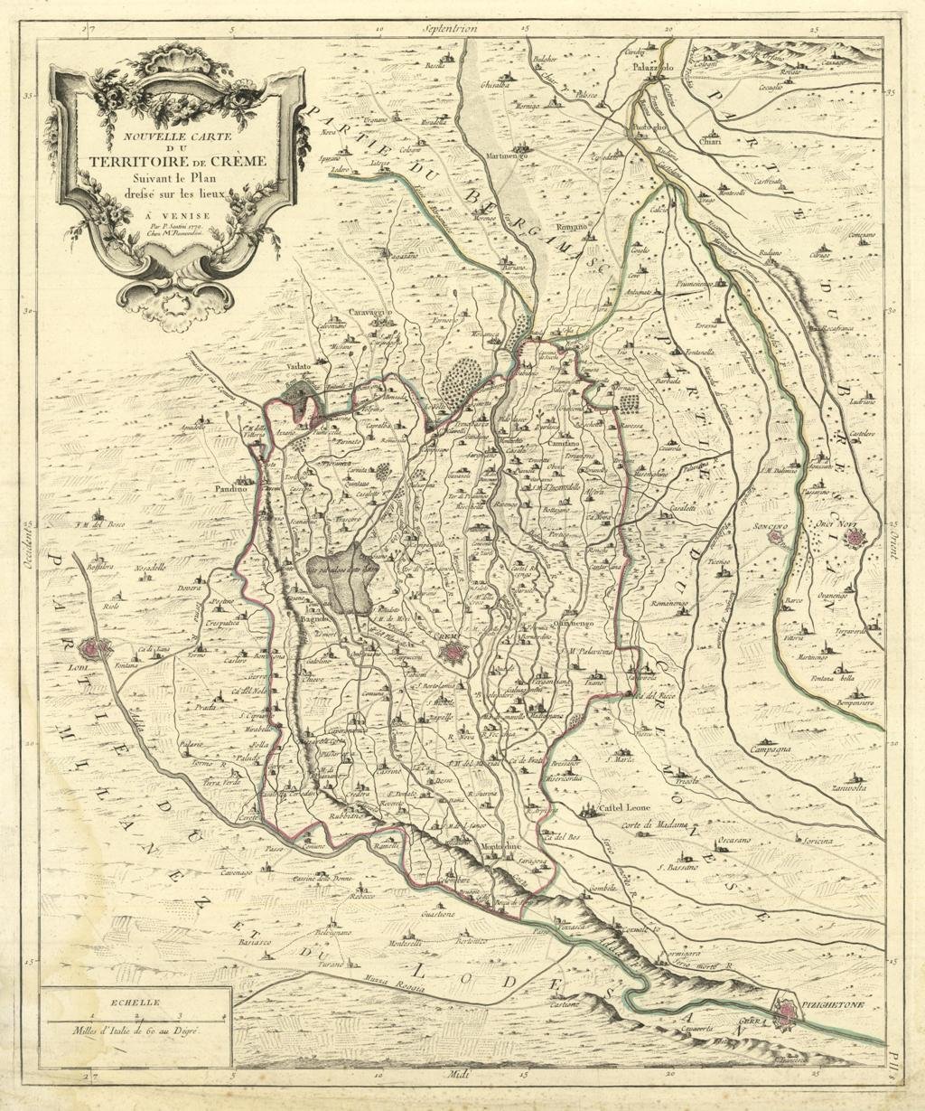 Carta geografica del territorio cremasco, con coloritura coeva ai confini. Buone condizioni, piega, leggero alone in basso a sinistra