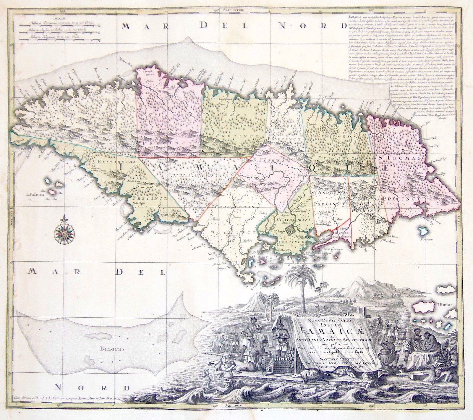 Incisione in rame, coloritura originale d'epoca, mm 495x550, in basso a destra bel cartiglio con scena indigena, in alto a destra una descrizione dettagliata della Jamaica. Seutter, dopo un apprendistato presso Homann a Norimberga, trasferitosi ad Augsburg verso il 1720, aprì la propria attività superando il maestro sotto il profilo della bellezza: le sue carte hanno sempre colori brillanti e cartigli elaborati. Infatti è presente un bellissimo cartiglio decorato a destra con varie raffigurazioni allegoriche, mentre nell'angolo sinistro è presente una scala delle miglia decorata. Buon esemplare<BR>con leggere tracce di sporco superficiale, un alone al centro in basso, piccoli difetti e qualche strappo restaurato marginale.