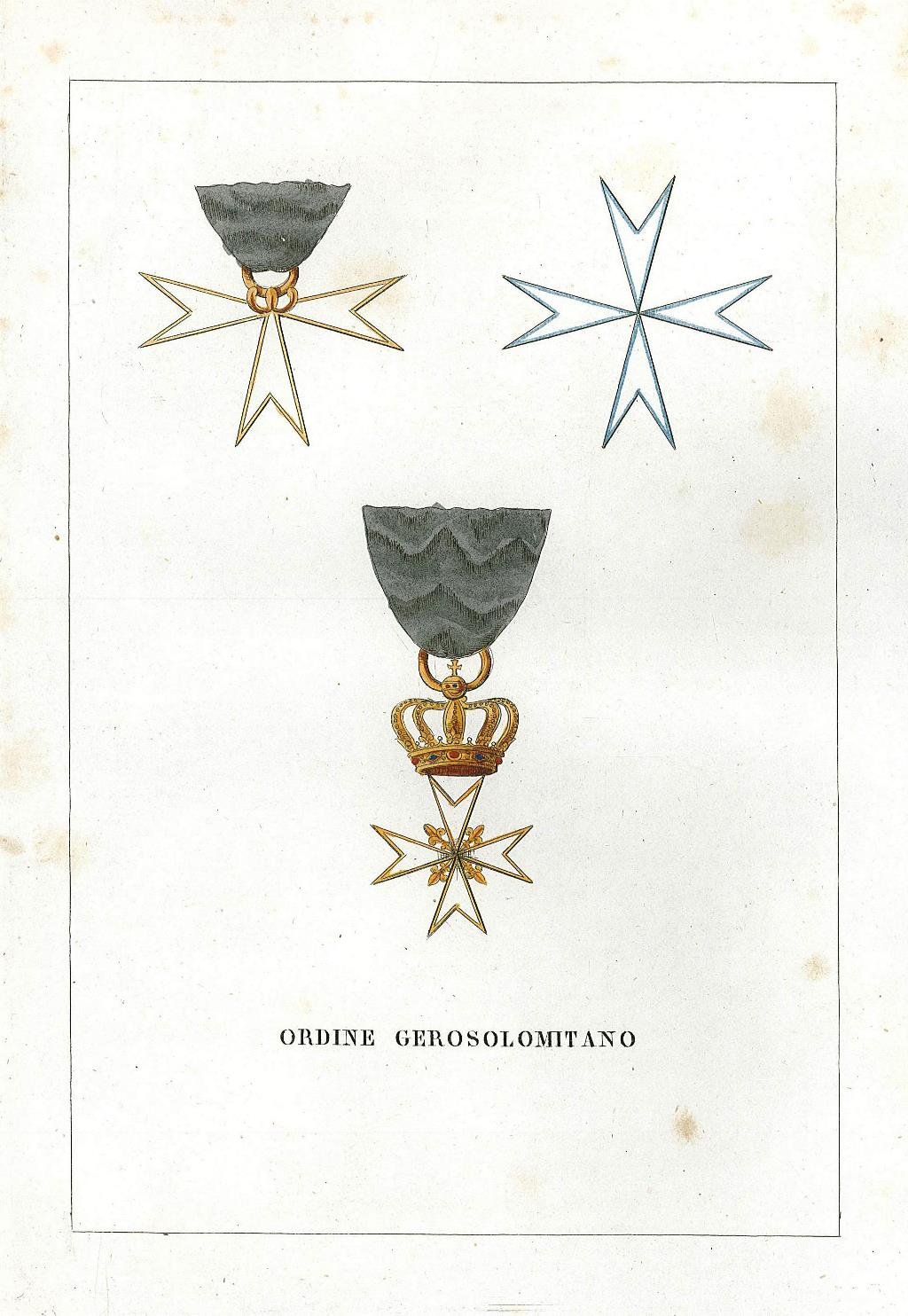 Stemma araldico dell'ordine di cavalleria, finemente colorato a mano all'epoca con vivace acquerellatura a tempera. Inserita in una delle più importanti opere sull'araldica italiana in cui sono descritte ben 459 famiglie. L'opera è composta da bellissime incisioni di stemmi nobiliari in coloritura coeva e descrizioni genealogiche delle più importanti famiglie. Inserita in "Teatro araldico ovvero raccolta generale delle armi ed insegne gentilizie delle più illustri e nobili casate che sisterono un tempo e che tuttora fioriscono in tutta l'Italia. illustrate con relative genealogico-storiche nozioni da L. Tettoni e F. Saladini" Edita in Lodi e Milano pei tipi di Cl. Wilmant e figli dal 1841 al 1851. La stampa è accompagnata da pagine di testo storico descrittivo. Piccole macchioline