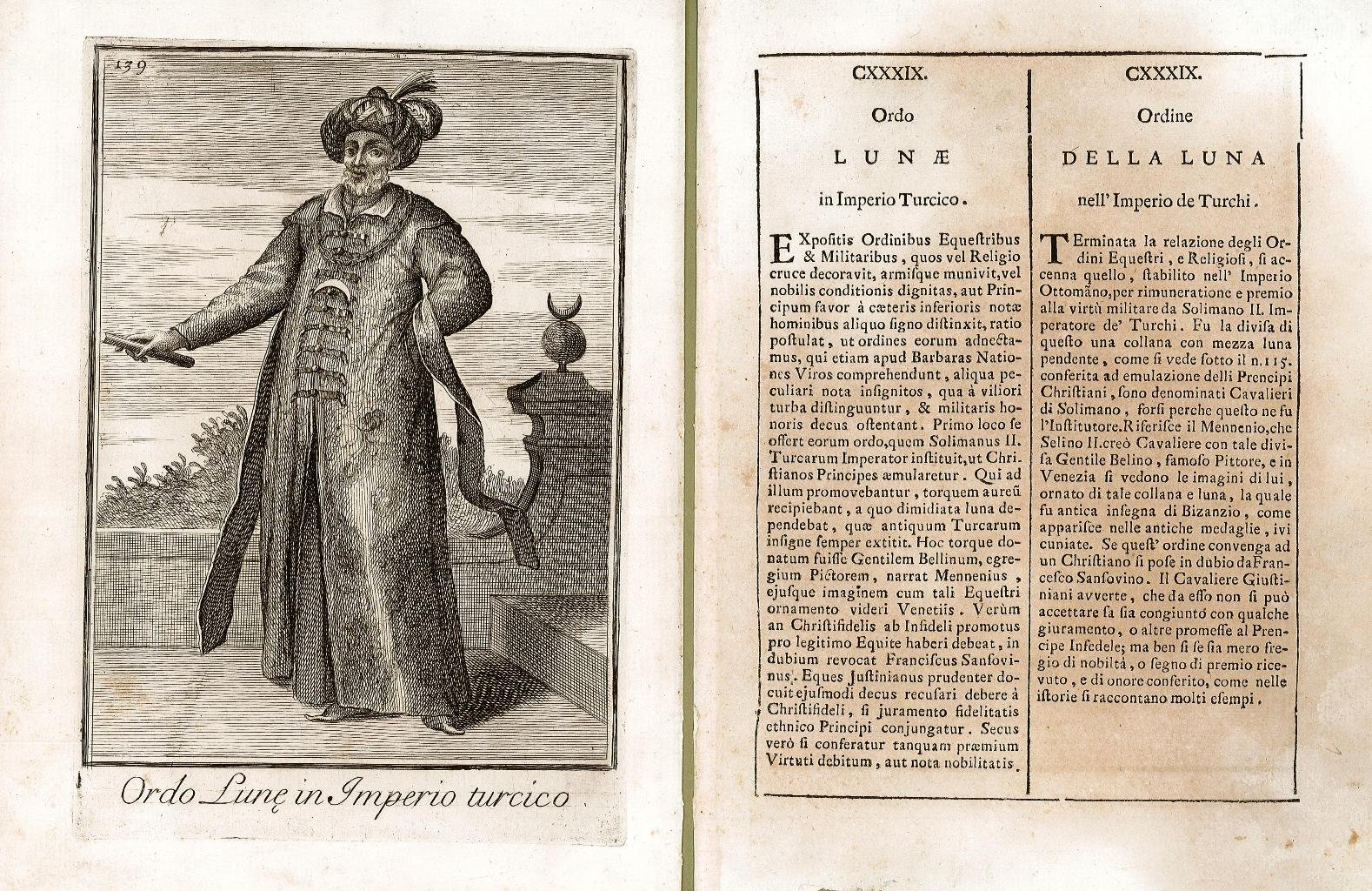 Incisione, antica ed originale, raffigurante il Religioso Ordine della Luna nell'Impero dei Turchi accompagnata da pagina descrittiva divisa su due colonne, a sinistra in latino ed a desta in italiano, con la storia del costume dell’ordine militare rappresentato. Inserita nell’opera “Catalogo degli ordini equestri e militari. Esposto in imagini, e con breve racconto offerto alla Santità di N.S. Clemente XI dal P. Filippo Bonanni della Compagnia di Giesu” In Roma MDCCXI – Nella Stamperia di Giorgio Placco Intagliatore, e Gettatore di Caratteri à S. Marco. Con licenza de’ Superiori