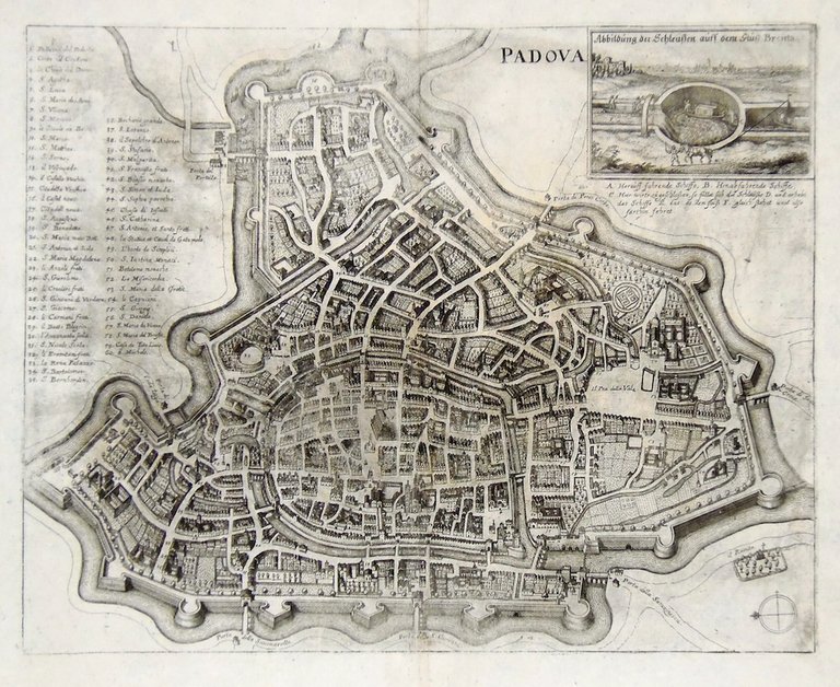Incisione in rame, mm 360x280. Pianta prospettica della città, tratta da "Itinerarium Italiae". Ottimo esemplare in forte impressione con piccola mancanza al margine bianco destro in alto che non intacca l'inciso.
