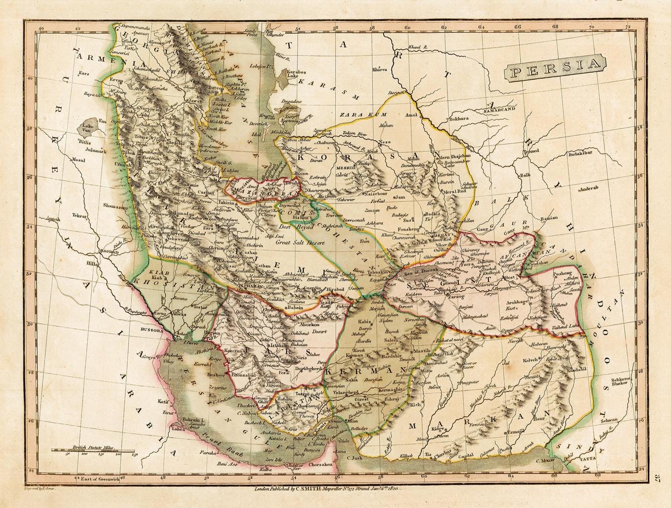 Carta geografica, in coloritura coeva, riguardante la Persia. Inserita nell'opera "Smith's New General Atlas Containing Distinct Maps Of all the Principal Empires, Kingdoms, & States Throughout the World arranged according to the General Treaty signed in Congress at Vienna June 1815 - London, Printed for C. Smith, Mapseller extraordinary, To His Majesty. N° 172 Strand with additions 1822 to 1824". Edizione non menzionata dal Phillips