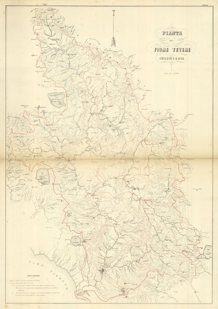 Carta geografica molto dettagliata del fiume Tevere con i suoi affluenti per tutta la sua lunghezza, in rosso sono evidenziati i confini del suo bacino embrifero. In basso a sinistra tabella de l'Indicazione. Edita a Firenze e Roma dallo Stabilimento Litografico Ach Paris, 1872. Restauro alla piega