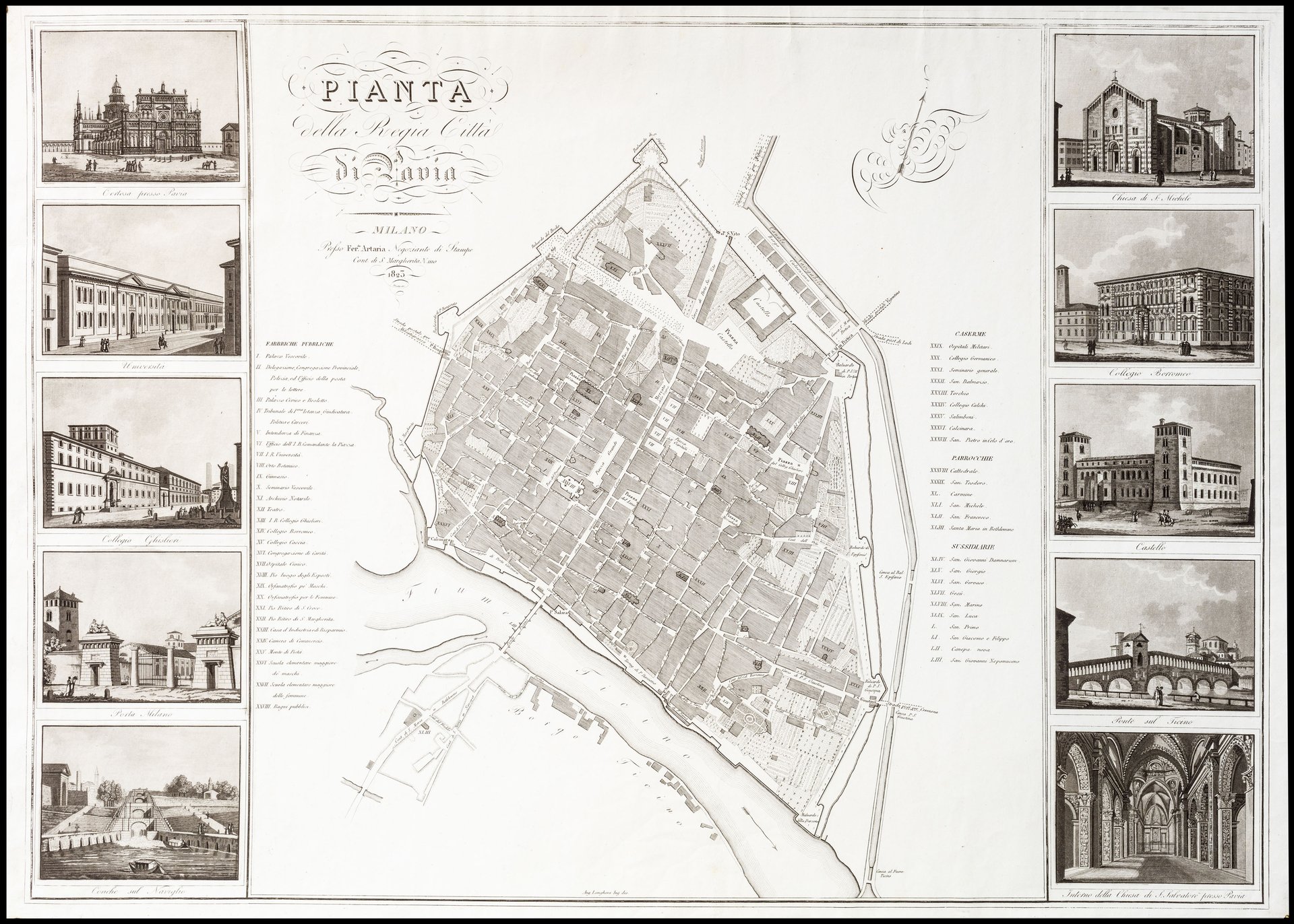 Incisione in rame, su disegno dell'ingegnere Angelo Longhera, mm 530x760. Grande pianta di Pavia con 53 rimandi laterali e 10 vedute parziali (ognuna mm 89x116) eseguite in acquatinta, che riproducono i più importanti scorci cittadini. Esemplare molto bello a pieni margini con barbe. Sinistri-Belloni, Le antiche stampe di Pavia e provincia, n. 186 <BR>