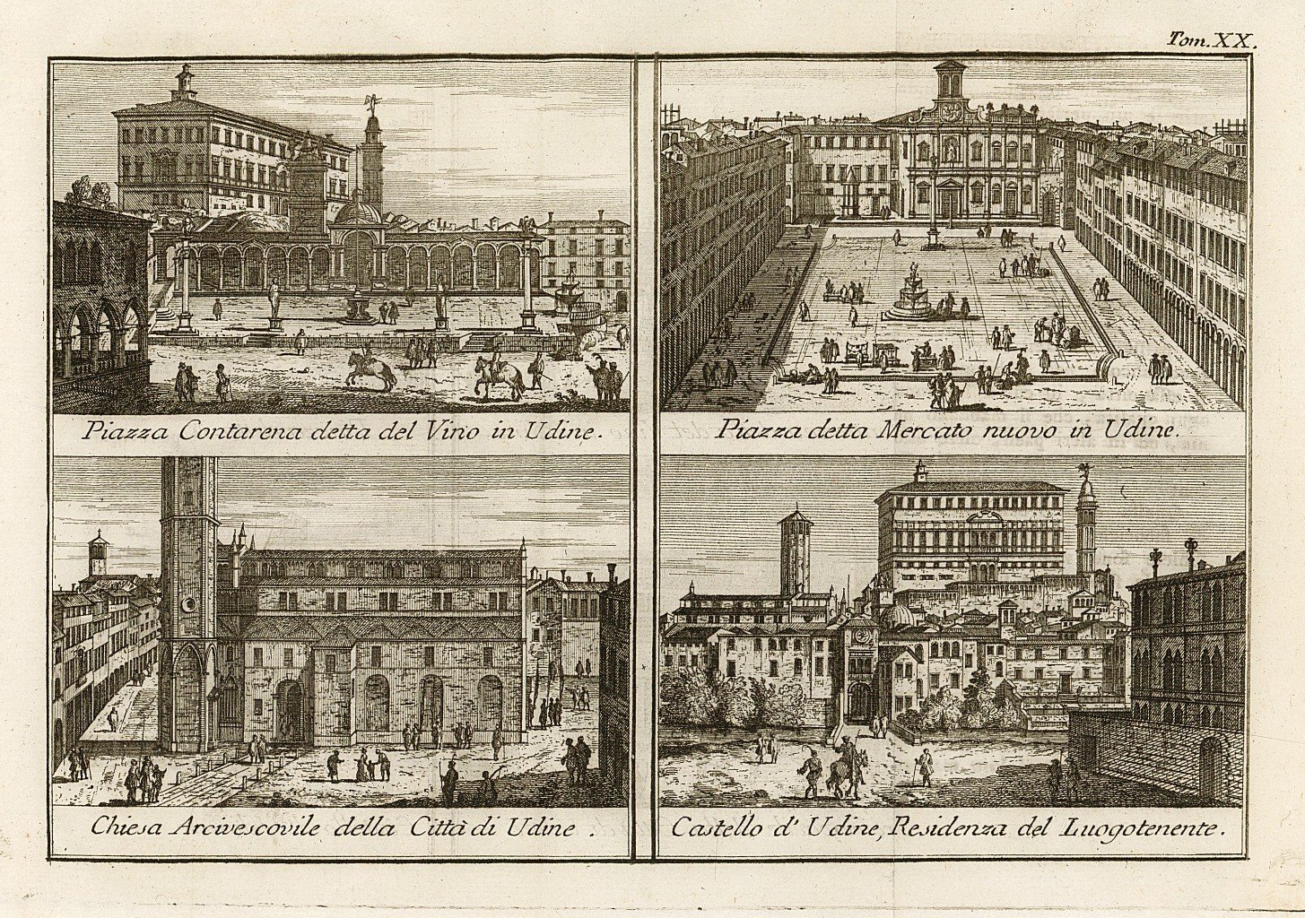 Veduta composta da quattro scorci della città di Udine: Piazza Contarena detta del Vino, Piazza del Mercato Nuovo, Chiesa Arcivescovile ed il Castello di Udine residenza del Luogotenente. Pieghe editoriali. Autore: Salmon Thomas. Luogo: Udine. Anno: 1753. Tecnica: incisione in rame. Dimensioni: 145x215 mm