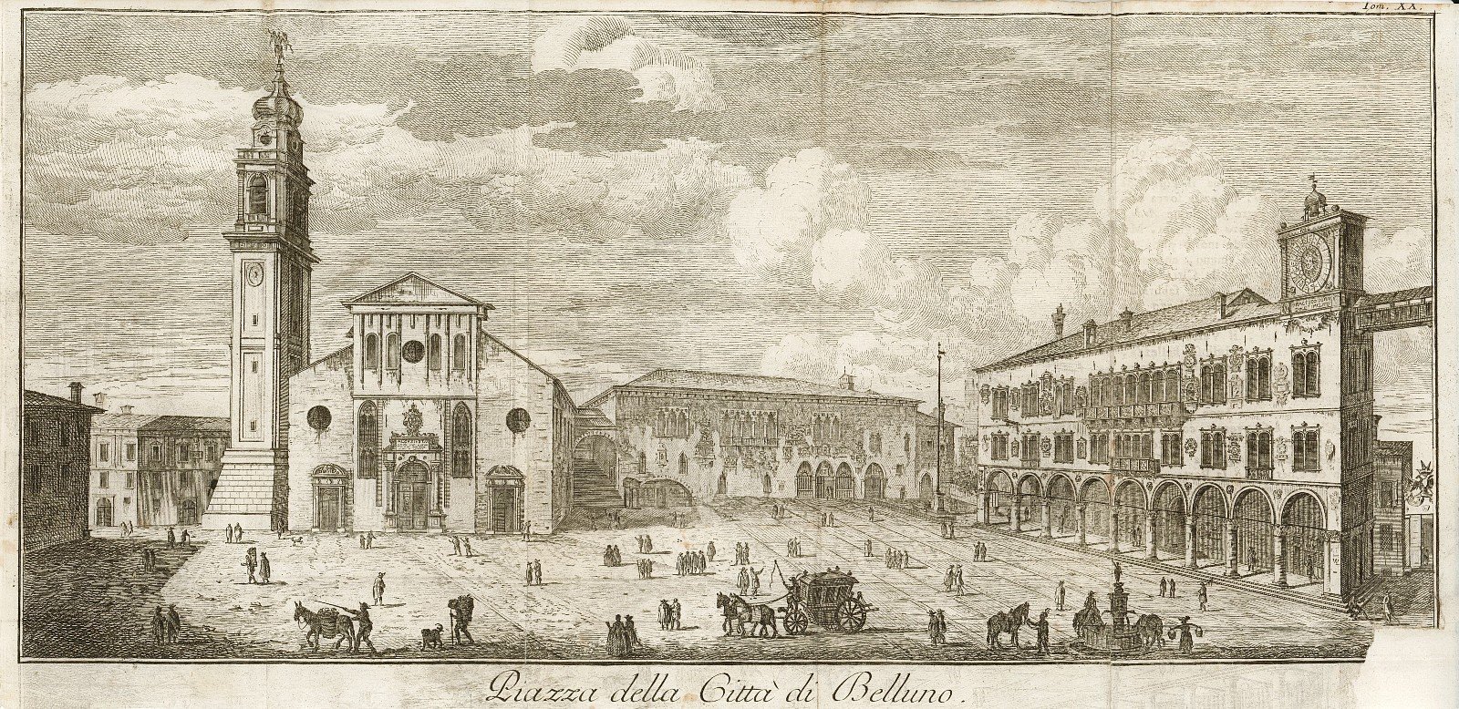 Veduta di piazza Duomo nella città di Belluno. La scena è animata dalla presenza di numerosi personaggi raffigurati nello svolgimento delle attività quotidiane. Autore: Salmon. Luogo: Belluno. Anno: 1753. Tecnica: incisione in rame. Dimensioni: 178x382 mm. Pieghe editoriali. Restauro conservativo nell'angolo in basso a destra che interessa una piccola porzione di inciso.