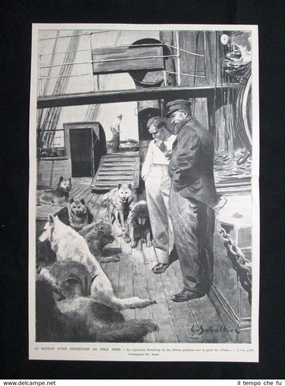 Polo Nord: Capitano Sverdrup e i suoi cani sul ponte del "Fran" Stampa del 1902