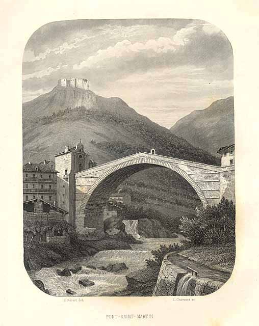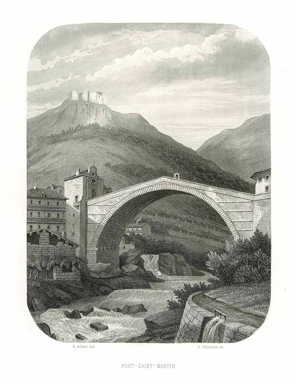 Stampa antica ed originale con veduta in primo piano del ponte e sullo sfondo il castello. Tratta dall'opera " La Vallée d'Aoste " stampata a Parigi da Amyot. Autore: Aubert E. del. - E. Chavanne sc. Luogo: Valle d'Aosta - Saint - Martin. Anno: 1860. Tecnica: incisione in acciaio. Dimensioni: 188x144 mm