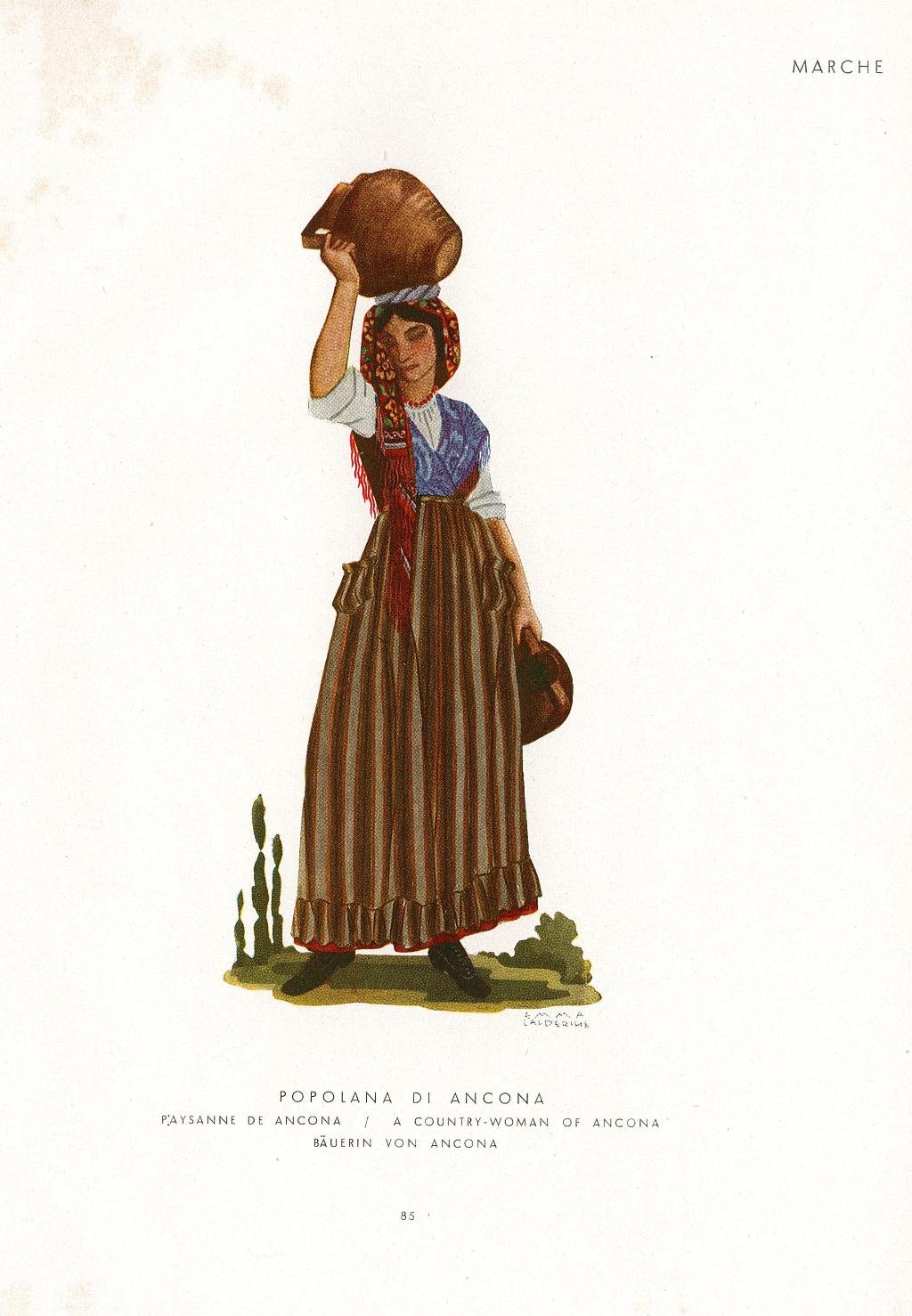 Stampa antica e originale raffigurante il costume caratteristico del luogo. Autore: Calderini Emma. Luogo: Ancona. Anno: 1920. Tecnica: tipolitografia. Dimensioni: 210x130. Tratta dall'opera " Il costume popolare in Italia " edita a Milano da Sperling & Kupfer