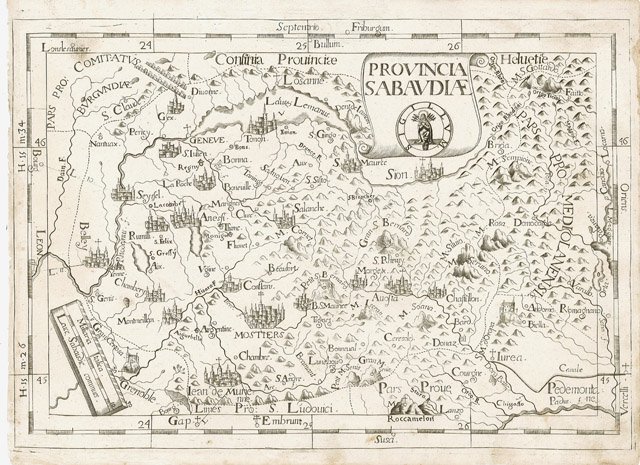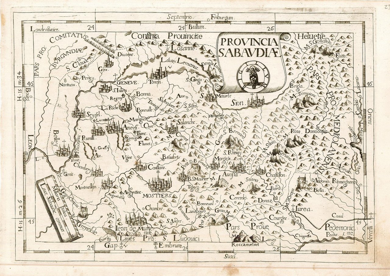 Carta geografica raffigurante il territorio dell'antica Savoia oggi suddiviso tra Valle d'Aosta, Francia e Svizzera. Lungo il confine con il Milanese sono indicati il Monte Sempione, il Monte Rosa ed il Cervino. A protezione di Aosta sono indicati il Gran San Bernardo ed il Piccolo San Bernanrdo. Sono indicati i maggiori centri abitati, quali: Aosta, Chatillon, Ivrea, Donaz,Bard, Biella, Mostiers, Salanche, Sion, Geneve, Morgex etc. La carta è corredata da relativa Dichiarazione in cui sono riportati alcuni dati, quali: numero degli Arcivescovadi, dei Vescovadi, delle Università, degli Ospizi, indicazione dei confini etc. Per questa edizione della "Chorographica descriptio provinciarum et conventuum.S. Francisci Capucinorum.", curata dal ministro provinciale di Milano Giovanni Battista da Cassine, su espressa richiesta del Ministro Generale Agostino da Latisana, le tavole furono nuovamente incise con un disegno generale e coordinate geografiche del tutto differenti dalle precedenti edizioni. Gli incisori delle carte di questa edizione sono da individuarsi nelle figure di Simone Durello ed il Padre Cappuccino Michelangelo de Dinant.