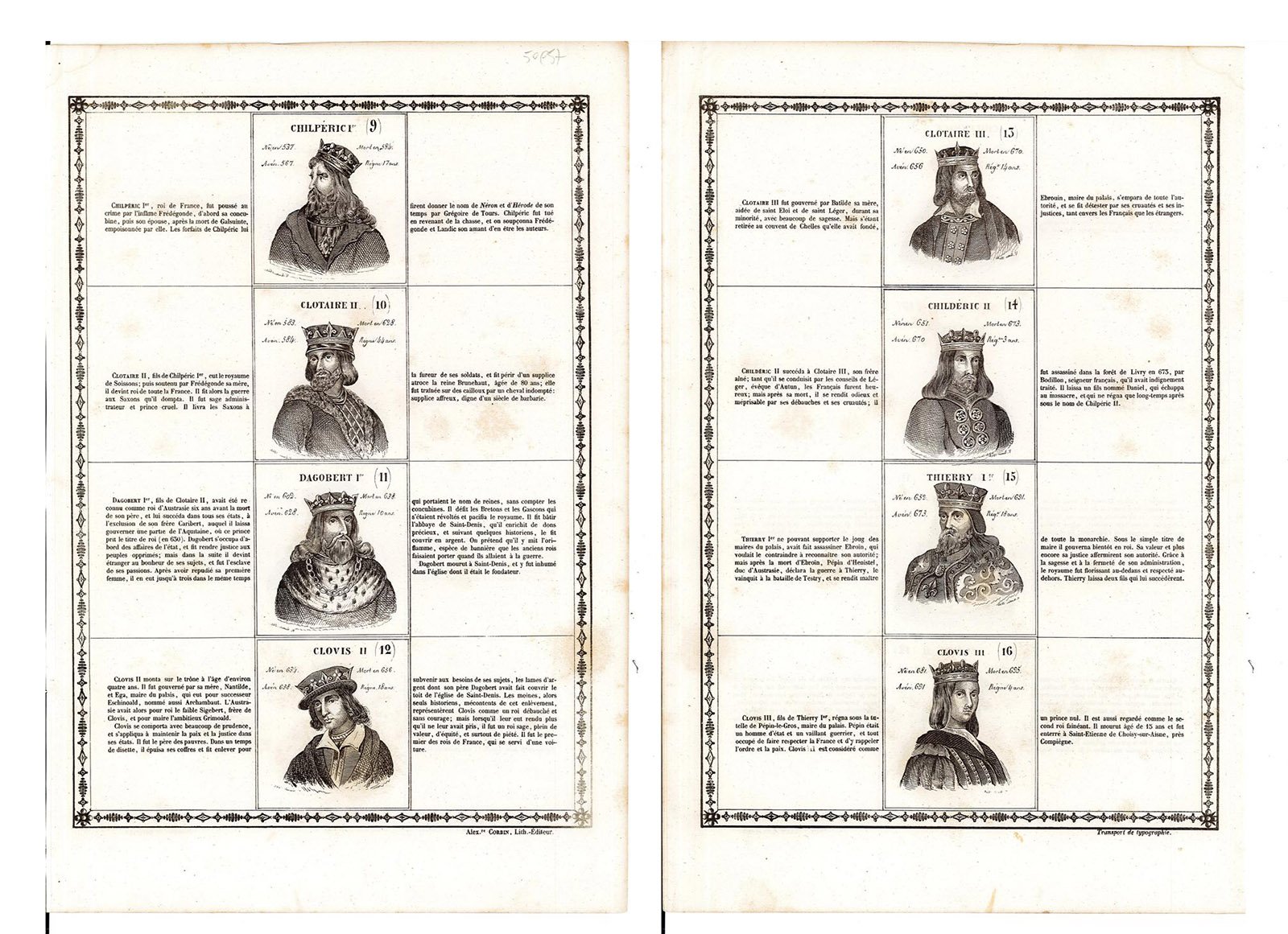 Rappresentazione dei Re di Francia con ai lati la descrizione, su due facciate avanti e retro dal 9° al 16°: Chilpéric I°, Clotaire II, Dagobert I°, Clovis II, Clotaire III, Chlidéric II, Thierry I°, Clovis III.Inserita nell'opera "Histoire de la France, Depuis Pharamond jusqu'à Louis Philippe 1.er (420 - 1842) Par J. Henry, maitre de pension, Géomètre de primièr classeet Imprimeur litographe" edita dall'Autore Alexandre Corbin Litografo ed editore a Tours nel 1842
