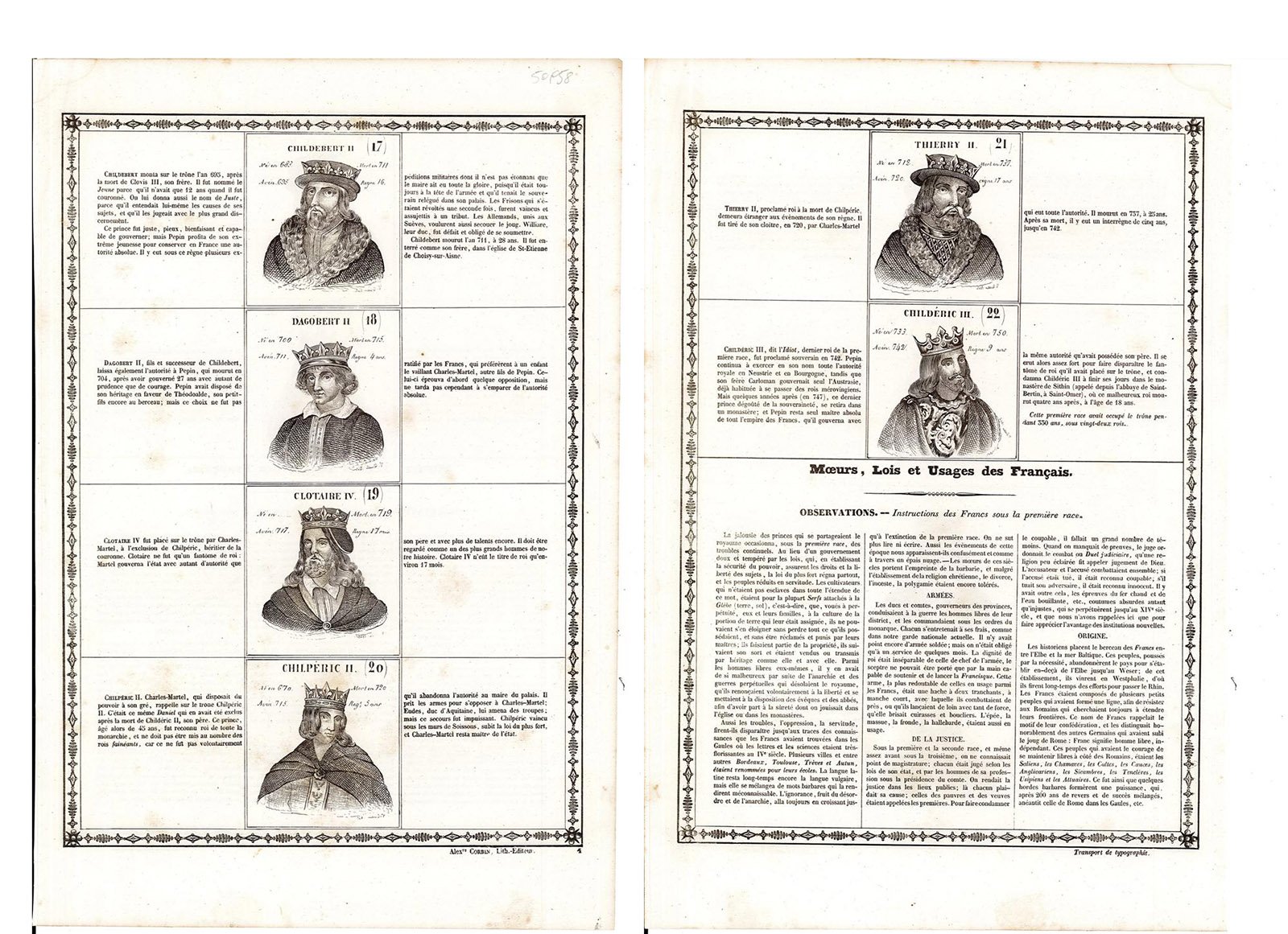 Rappresentazione dei Re di Francia con ai lati la descrizione, su due facciate avanti e retro dal 17° al 22°: Childebert II, Dagobert II, Clotaire IV, Chilpéric II, Thierry II, Childéric III.Inserita nell'opera "Histoire de la France, Depuis Pharamond jusqu'à Louis Philippe 1.er (420 - 1842) Par J. Henry, maitre de pension, Géomètre de primièr classeet Imprimeur litographe" edita dall'Autore Alexandre Corbin Litografo ed editore a Tours nel 1842