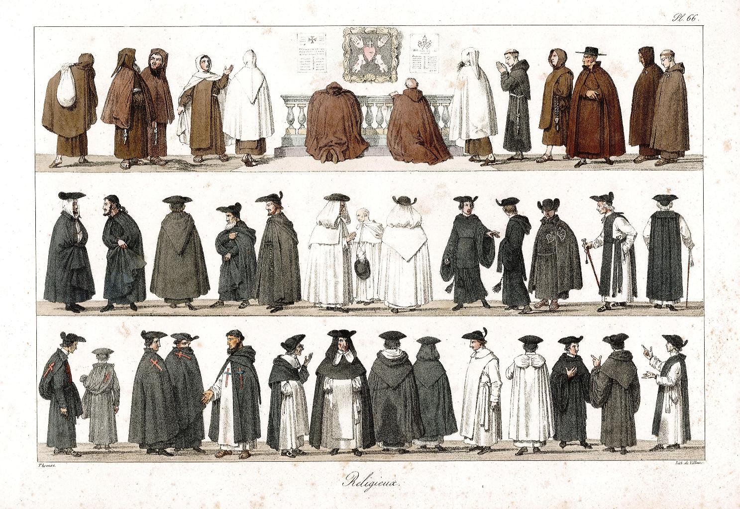 Litografia in coloritura coeva raffigurante religiosi di diversi ordini