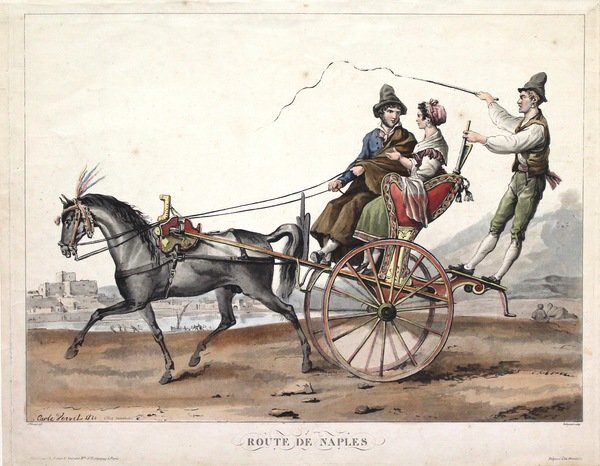 Acquatinta firmata in basso a sinistra "Carle Vernet 1820" nella matrice e "C. Vernet del" appena sotto.<BR>Elegante stampa di costume raffigurante una coppia su un calesse verso Napoli, il Vesuvio si intravede sullo sfondo. Debucourt è considerato il padre dell'acquatinta francese, uno dei più quotati incisori di inizio XIX secolo. Ben conservata, margini di pochi mm oltre alla battuta del rame.<BR>