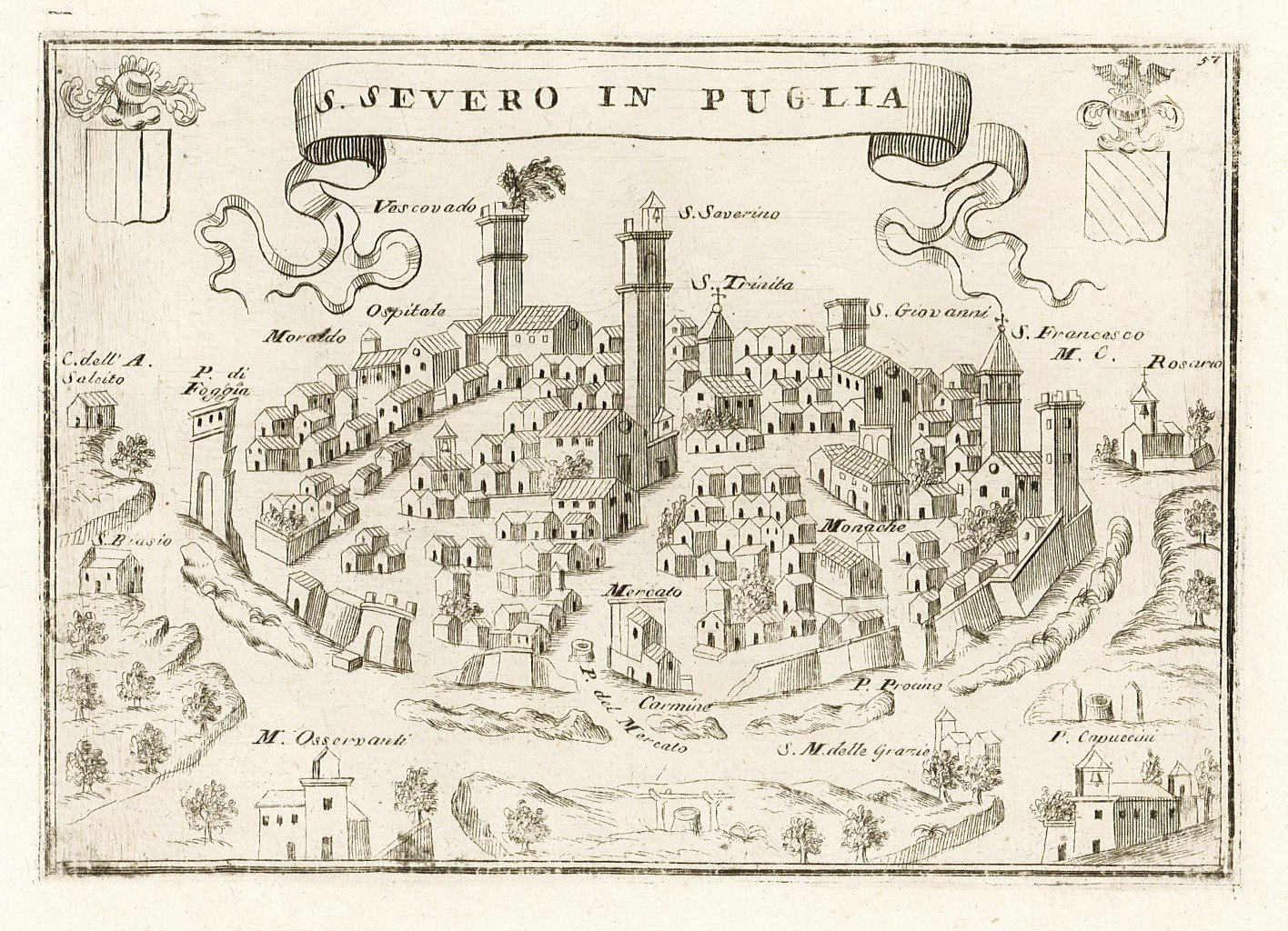 Veduta prospettica, antica e originale del 1707, della cittadina di San Severo in puglia. Inserita nella rara opera "Teatro della Guerra diviso in XXXXVIII parti" del Coronelli edito a Venezia tra il 1706 ed il 1709. Questa veduta è inserita nel volume a titolo "Regno di Napol" del 1707