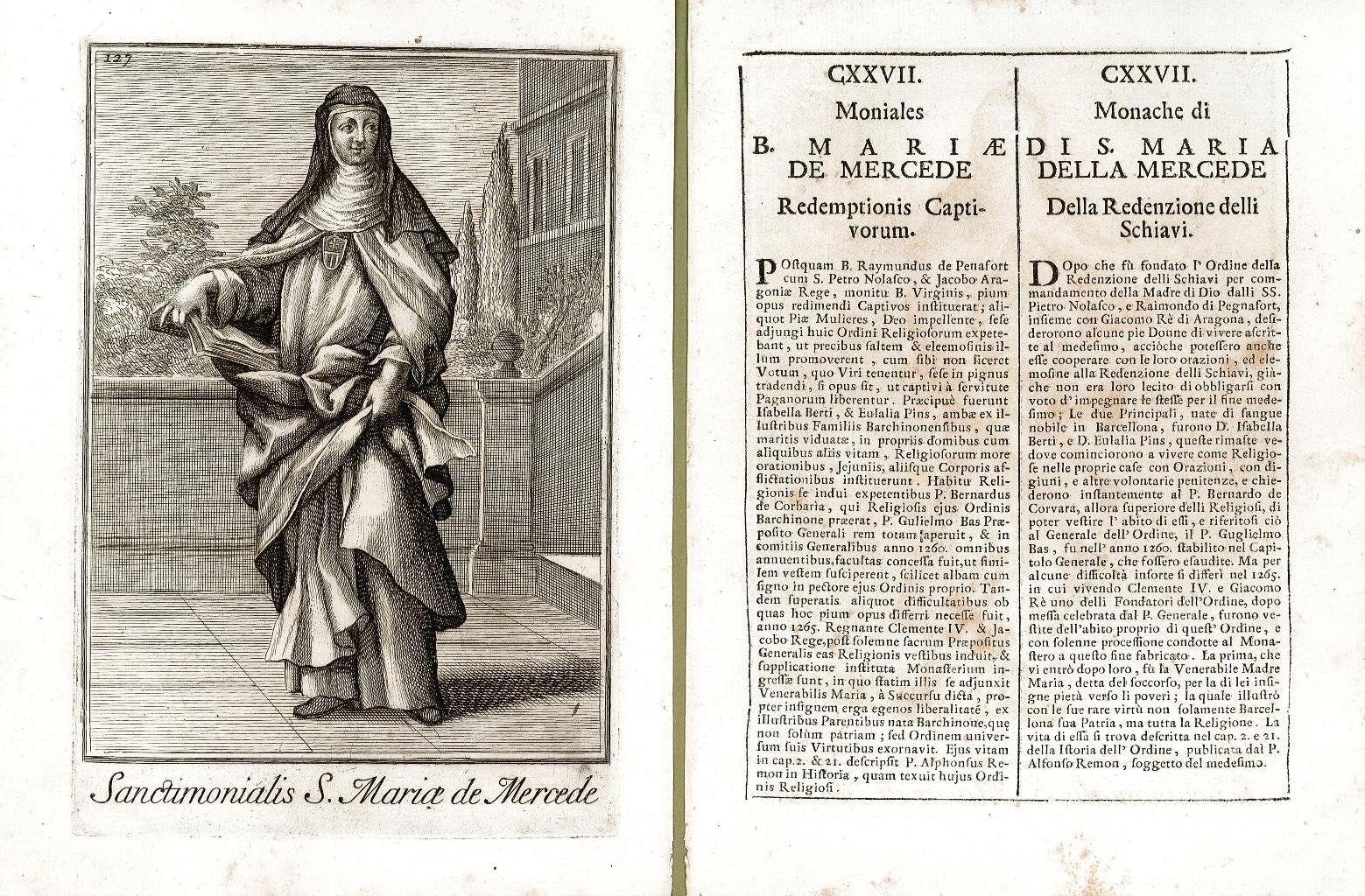 Incisione, antica ed originale, raffigurante la Monaca di Santa Maria della Mercede della Redenzione degli Schiavi accompagnata da pagina descrittiva divisa su due colonne, a sinistra in latino ed a desta in italiano, con la storia del costume dell’ordine militare rappresentato. Inserita nell’opera “Catalogo degli ordini equestri e militari. Esposto in imagini, e con breve racconto offerto alla Santità di N.S. Clemente XI dal P. Filippo Bonanni della Compagnia di Giesu” In Roma MDCCXI – Nella Stamperia di Giorgio Placco Intagliatore, e Gettatore di Caratteri à S. Marco. Con licenza de’ Superiori