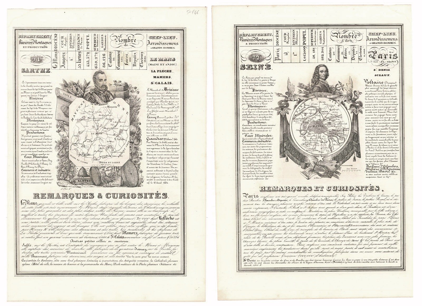 Carta n° 71 del Dipartimento Sarthe inserita in un medaglione centrale sormontato da un ritratto di Le Maréchal de Brissac. Questa è circondata da spiegazioni e osservazioni riguardanti l'economia, la geografia e la storia di quel territorio in cui si evidenziano le cittadine di Le Mans (Maine et Anjou), La Fleche, Mamers, St. Calais.Al retro la carta n° 72 del Dipartimento della Seine in un medaglione centrale sormontato da un ritratto di Francois Voltaire. Anche questo è circondato da spiegazioni e osservazioni riguardanti l'economia, la geografia e la storia di quel territorio in cui si evidenziano le cittadine di Paris (Ile de france) St. Denis, Sceaux.Inserita nell'opera "Nouvelle Géographie et Statistique de La France Alger et La Belgique, Suive d'un Traité sur le Mone entier. Ornée de 95 cartes approuvée de l'Université pa J. Henry, maitre de Pension" edita dall'Autore Alexandre Corbin Litografo ed editore a Tours nel 1842