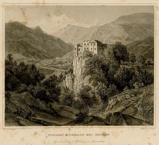 Incisione su acciaio di dimensioni 12x15 cm. Condizioni : USATO - Stato : Buono, ordinari segni d'uso e del tempo. Altre note : Veduta di castel Kuehbach (o Kiebach o Haselburg o Flavon), presso Bolzano. L'edificio fu dei signori von Haslach e divenne oggetto di numerose distruzioni e rifacimenti. Costruito nel XII secolo venne poi riedificato con differenze sostanziali tra il 1475 ed il 1541 dai Signori di Fiè. Sullo sfondo la conca di Bolzano con il torrente Talvera, secondo un'impostazione che si ripete nel XIX secolo."<br>