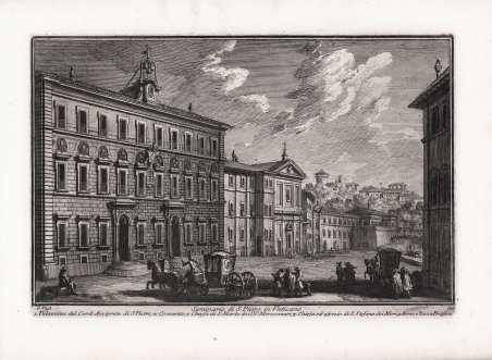 Veduta tratta dalla monumentale opera ' Delle magnificenze di Roma antica e moderna.Pubblicata in 10 volumi dal 1747 al 1761, l’opera presenta 238 incisioni in rame, ciascuna incisione con testo narrativo che fornisce informazioni storiche e documentarie. ' Conosciuto dai più semplicemente come il "maestro" di Giovanni Battista Piranesi, Giuseppe Vasi rivela in quest'opera monumentale la pienezza della sua creatività grafica. I 10 libri che la compongono hanno ognuno un frontespizio con titolo e data diversi: ' Libro primo che contiene le porte e mura; Libro secondo, che contiene le piazze principali di Roma con obelischi, colonne, ed altri ornamenti; Libro terzo, che contiene le basiliche e chiese antiche di Roma; Libro quarto che contiene i palazzi e le vie più celebri; Libro quinto che contiene i ponti e gli edifizj sul Libro sesto che contiene la chiese parrocchiali; Libro settimo che contiene i conventi e case dei chierici regolari; Libro ottavo che contiene i monasteri e conservatorj di donne; Libro nono che contiene i collegj, spedali, e luoghi pii; decimo che contiene le ville e giardini più rimarchevoli. Le ' Magnificenze ' forniscono un panorama completo e al tempo stesso anticonvenzionale dell'Urbe: così, insieme alle consuete, celeberrime inquadrature desunte dalla migliore tradizione vedutistica, si trova anche una Roma insolita, quella che, talvolta, non esiste più. A quest'opera, di centrale importanza nell'editoria romana di metà Settecento, l'Autore aveva lavorato per quasi un ventennio realizzando una monumentale guida dell'Urbe dove accanto alle consuete e celeberrime inquadrature tratte dalla migliore tradizione vedutistica, immortala anche scorci insoliti che sono poi scomparsi con il cambiare della città. Il testo che accompagna le vedute nel primo volume è opera di Giuseppe Bianchini, nel secondo di Orazio Orlandi e nei restanti del Vasi stesso. A partire dall'edizione del 1786, l'opera del Vasi, fu aggiornata dal figlio Mariano, che la pubblicò col titolo ' Raccolta delle più belle vedute antiche, e moderne di Roma, mostrando solo il nome del padre come autore. Questa nuova edizione presentava molte tavole della prima edizione, ed alcune nuove. Anche la pubblicazione di Mariano Vasi fu stampata più volte, sempre con l’aggiunta di nuove tavole. Esemplare tratto dalla seconda edizione del 1772. Acquaforte, stampata su carta vergata coeva, completa dei margini, in ottimo stato di conservazione. ' View taken from the monumental work ' Delle magnificenze di Roma antica e moderna. Published in 10 volumes from 1747 to 1761, the work features 238 copper engravings, each engraving with a narrative text that provides historical and documentary information. Known by most simply as the "master" of Giovanni Battista Piranesi, Giuseppe Vasi reveals in this monumental work the fullness of his graphic creativity. The 10 books that compose it each have a title page with a different title and date: ' Libro primo che contiene le porte e mura; Libro secondo, che contiene le piazze principali di Roma con obelischi, colonne, ed altri ornamenti; Libro terzo, che contiene le basiliche e chiese antiche di Roma; Libro quarto che contiene i palazzi e le vie più celebri; Libro quinto che contiene i ponti e gli edifizj sul Libro sesto che contiene la chiese parrocchiali; Libro settimo che contiene i conventi e case dei chierici regolari; Libro ottavo che contiene i monasteri e conservatorj di donne; Libro nono che contiene i collegj, spedali, e luoghi pii; decimo che contiene le ville e giardini più rimarchevoli. The ' Magnificences ' provide a complete and at the same time unconventional panorama of the City: thus, together with the usual, celebrated shots taken from the best tradition of ' vedutistica, one also finds an unusual Rome, one that, at times, no longer exists. The author had worked on this work, of central importance in Roman publishing in the middle of the eighteenth century, for almost twenty years, producing a monumental guide to the “Urbe” where, alongside the usual and famous shots taken from the best tradition of ' vedutistica, he also immortalized unusual views that have since disappeared with the change of the city. The text that accompanies the views in the first volume is by Giuseppe Bianchini, in the second by Orazio Orlandi and in the remaining ones by Vasi himself. Starting from the edition of 1786, the work of Vasi, was updated by his son Mariano, who published it under the title ' Raccolta delle più belle vedute antiche, e moderne di Roma, showing only the name of his father as author. This new edition presented many plates of the first edition, and some new ones. The publication of Mariano Vasi was also printed several times, always with the addition of new plates. ' View taken from the second edition of the Vasi’s ' Delle Magnificenze di Roma Antica e Moderna ' (first edition, in X books, published between 1747-61), edited in 1772. Etching, printed on contemporary laid paper, in very good condition. Cfr. Scalabroni, 267