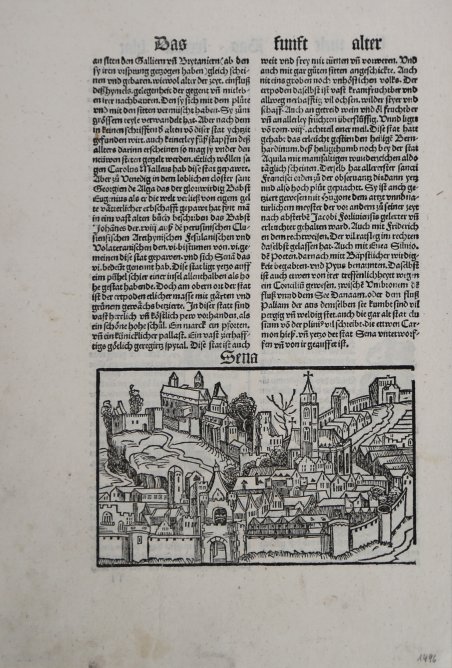Veduta fantastica della città posta nella parte inferiore del foglio che contiene anche il teste descrittivo, tratto dal Liber cronicarum cum figuris et umaginibus ab initio mudi usus mit temporis rarissima edizione "tascabile" della celebre cronaca del mondo, edita ad Ausburg presso Johann Schonsperger, nel 1496. Prima edizione in tedesco dello Schonsperger. Egli abbrevia sia il testo sia il formato dello Schedel per produrre un edizione che fosse più maneggevole a commerciabile di quella di A. Koberger. Silografia, posta nella parte inferiore di un foglio di testo, in ottimo stato di conservazione. Rara. An imaginary view of the city, printed on the lower part of the sheet with the descriptive text, taken from Liber cronicarum cum figuris et umaginibus ab initio mudi usus mit temporis, a very rare "pocket" edition printed in Ausburg by Johann Schonsperger, in 1496. First German edition realized by Schonsperger. He cut both text and the size realized by Schedel to relize an edition that was to be more handy and saleable. Woodcut, printed in the central part of a double text sheet, minor repair on central fold, otherwise in good condition. Rare. Cfr.