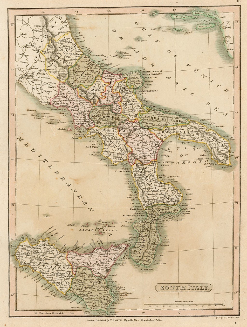 Carta geografica, in coloritura coeva, riguardante l'Italia meridionale inserita nell'opera "Smith's New General Atlas Containing Distinct Maps Of all the Principal Empires, Kingdoms, & States Throughout the World arranged according to the General Treaty signed in Congress at Vienna June 1815 - London, Printed for C. Smith, Mapseller extraordinary, To His Majesty. N° 172 Strand with additions 1822 to 1824". Edizione non menzionata dal Phillips