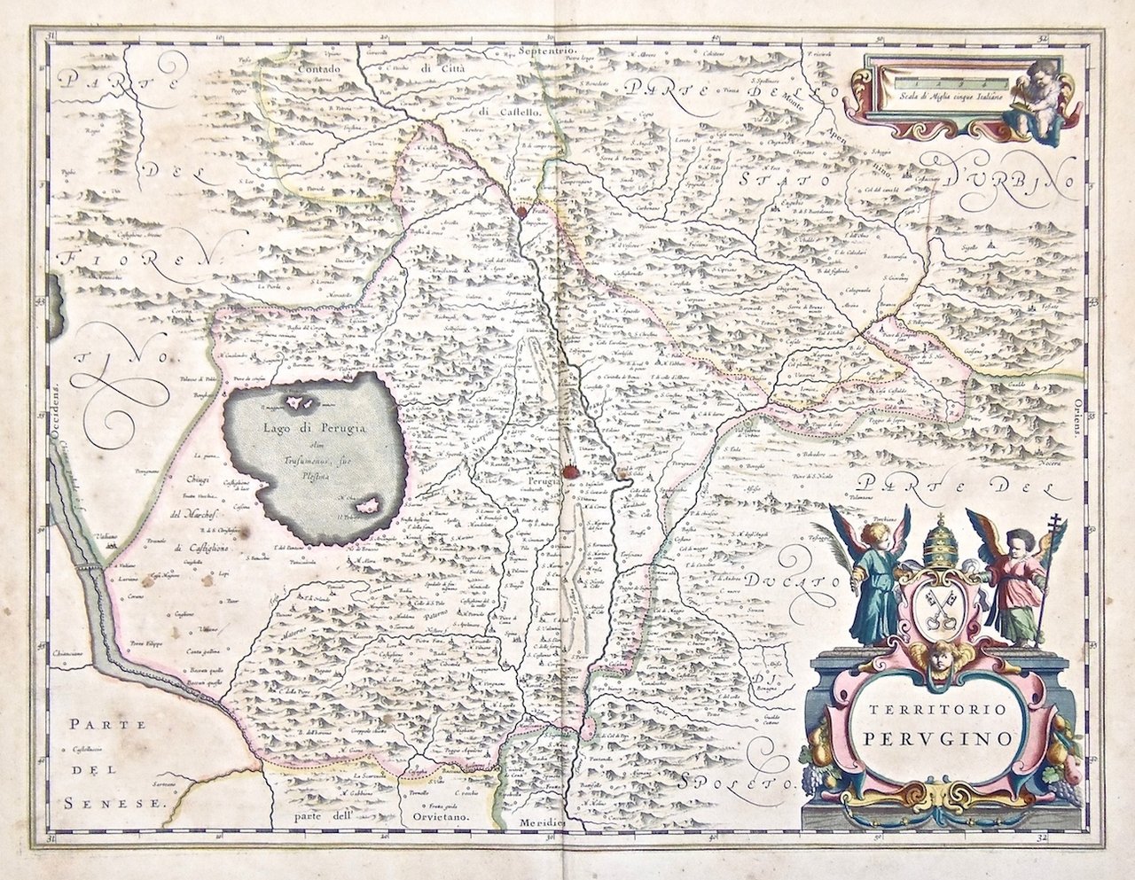 Incisione in rame, colorata d'epoca, mm 382x500. Elegante carta eseguita sul modello maginiano. Ottimo esemplare. W. Blaeu, astronomo allievo di Tycho Brahe, fondò un'officina per la costruzione di globi nel 1599; quasi immediatamente iniziò a pubblicare anche carte geografiche, giungendo nel 1630 alla creazione del primo atlante "Atlantis Appendix" e cinque anni dopo, della prima edizione in due tomi del "Atlas Novus". Dopo la sua morte nel 1638, a cura del figlio Johan si giunse nel 1662 alla pubblicazione del celebre "Atlas Maior" in 11 volumi. Nel 1672 un incendio distrusse l'officina e segnò la fine dell'attività.