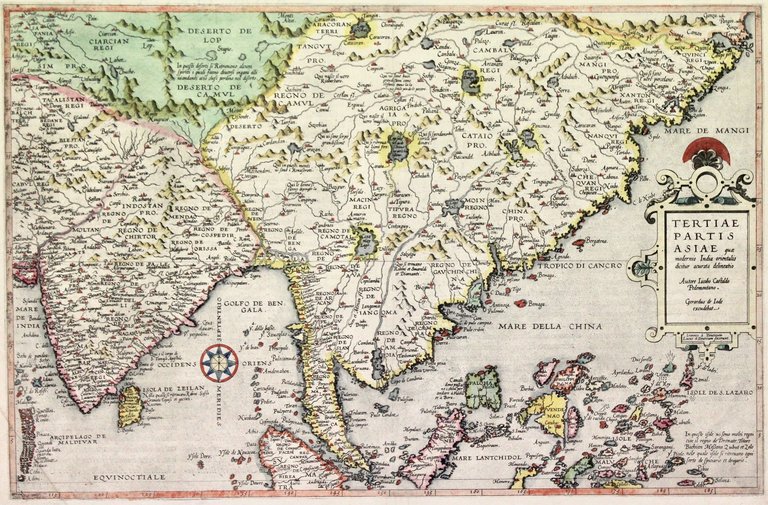 Incisione in rame, colorata d'epoca, mm 328x508, incisa dai fratelli Lucas e Jan Van Deutecum che firma in lastra. Raffigura tutto il sud est del continente dall'India alle Filippine. Tratta dal raro "Speculum Orbis Terrae", seconda edizione dell'atlante, curata dal figlio Cornelio con alcune varianti nel testo e nel numero delle tavole. De Jode (1509-1591) fu un cartografo, incisore, stampatore, editore attivo ad Anversa a metà del Cinquecento, nello stesso periodo di Ortelio, sebbene non sia stato in grado di uguagliare l'importanza dell'attività economica del rivale. Questo fece però si che le sue carte siano diventate decisamente più rare. Esemplare in ottimo stato di conservazione, piega all'angolo inferior sinistro.<BR>Copper engraving, original colour, mm 328x508, engraved by Joannes and Lucas van Deutecum, signed in the plate. <BR>It shows the Far East, with India, the Malay Peninsula (with 'Cingatola'), the Philippines & Moluccas. De Jode's source is Gastaldi the most important italian cartographer of the middle XVI century.<BR>Gerard De Jode was a competitor of Ortelius, active in the same period; but his atlas 'Speculum Orbis Terrarum' did not enjoy the same commercial success as Ortelius and now-a-days his maps are much rarer than Ortelius' ones.<BR>After the death of Gerard in 1591, the business was carried on by his widow and his son Cornelis, who re-issued the Speculum in 1593, most plates were newly engraved, and therefore making those of the first edition extremely rare.<BR>A very nice example with a fold in bottom left corner.<BR>
