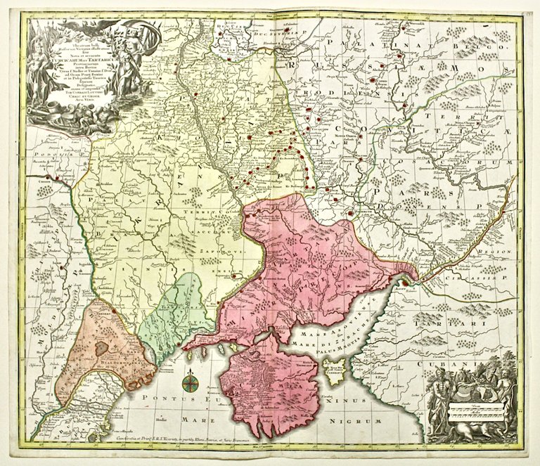 Theatrum Belli Russorum Victoriis illustratum sive nova et accurata Turcicarum et Tartaricum Provinciarum intra fluvios Tyras f. Niester fet Tanaim f. Don ad Oram Ponti Euxini et in Peloponeso Taurica sitarum designatio | Stampe | LOTTER TOBIAS CONRAD