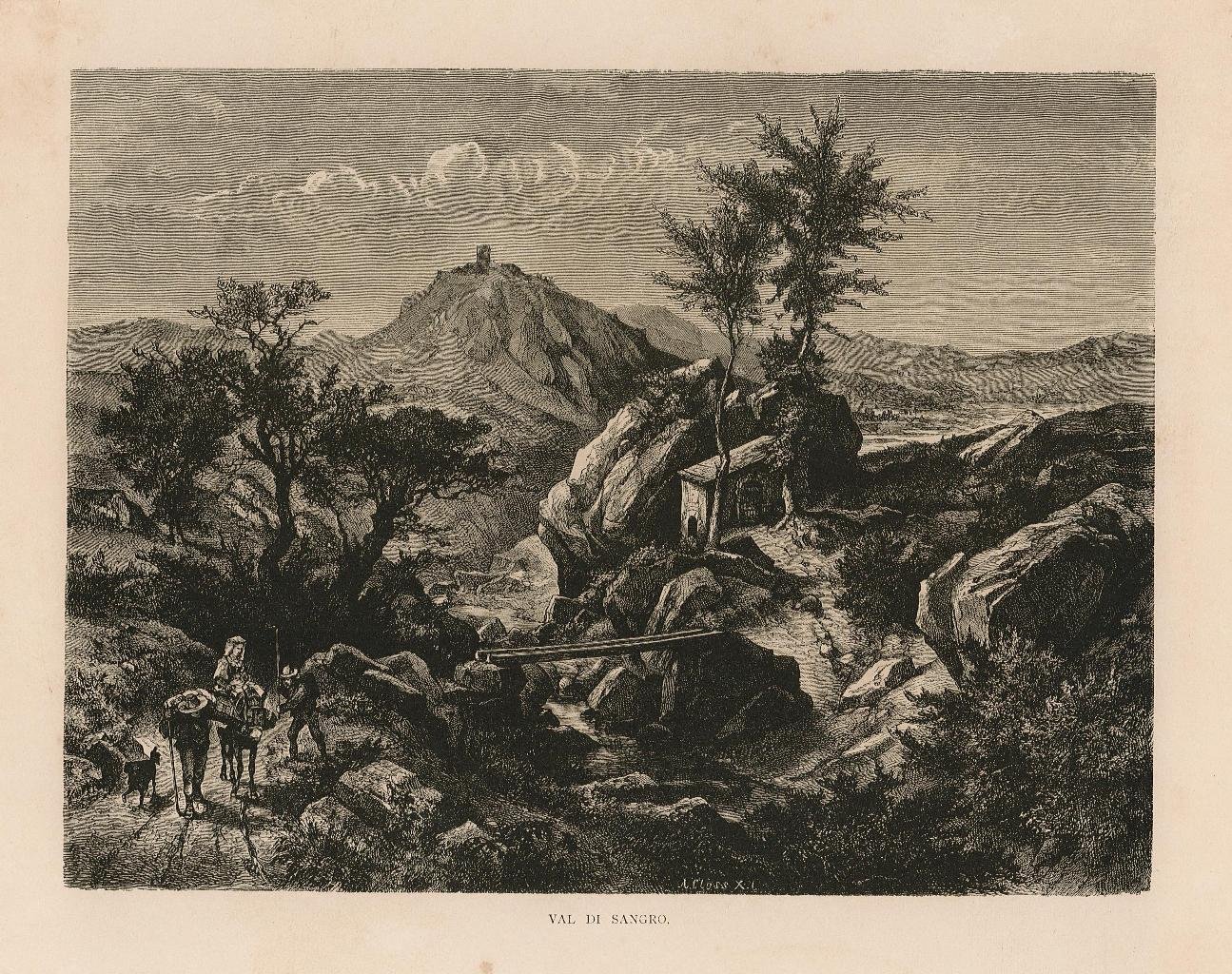 Stampa, antica e originale, con veduta panoramica della valle