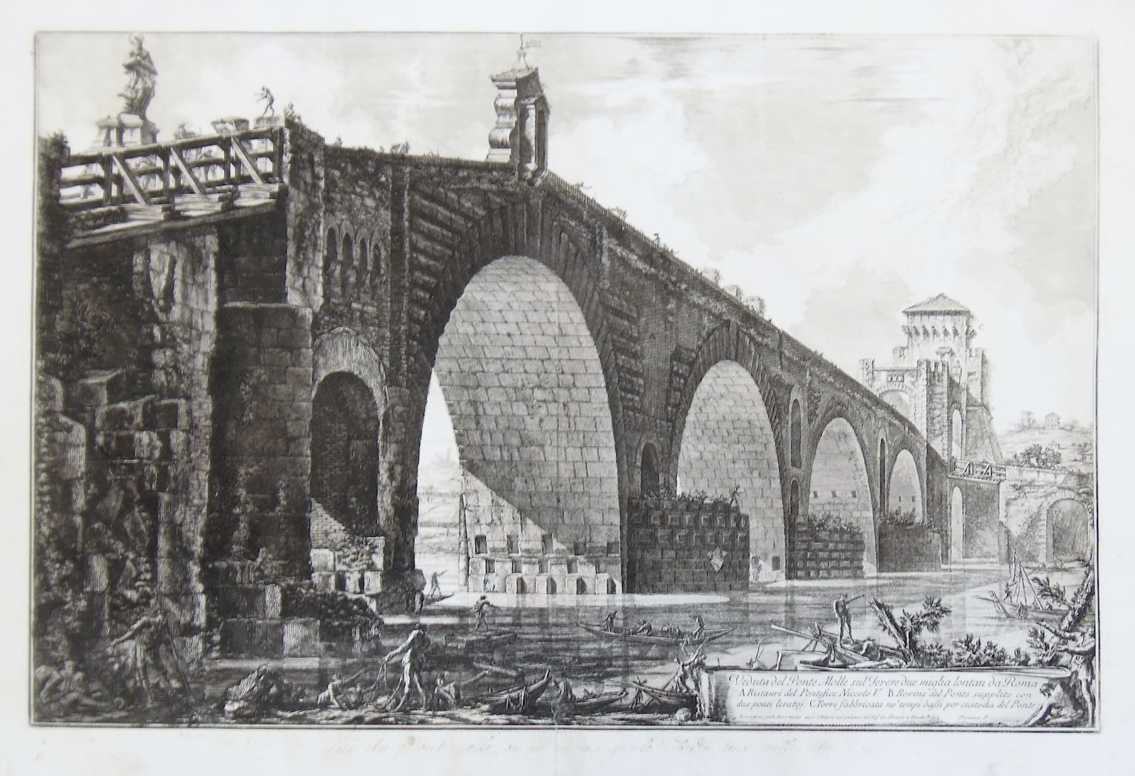 Acquaforte, bulino e puntasecca, di mm 435x660, tratta da "Vedute di Roma", la più conosciuta opera di Piranesi. Buon esemplare con ampi margini, impressa su carta vergata romana; complessivamente ben conservata, con qualche traccia di umidità e restauro a piccolo strappo dell'estremità inferiore della piega centrale. Traduzione francese del titolo manoscritta al margine inferiore slavata.<BR>Primo stato di quattro. Hind 64, I; Focillon 767 <BR>