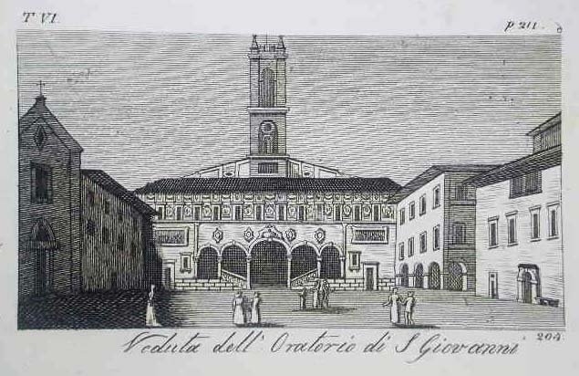 Stampa antica ed originale con veduta della piazza antistante l'Oratorio. Autore: Verico Antonio. Luogo: San Giovanni Val d'Arno - AR. Anno: 1827. Tecnica: incisione in rame. Dimensioni: 52x94 mm
