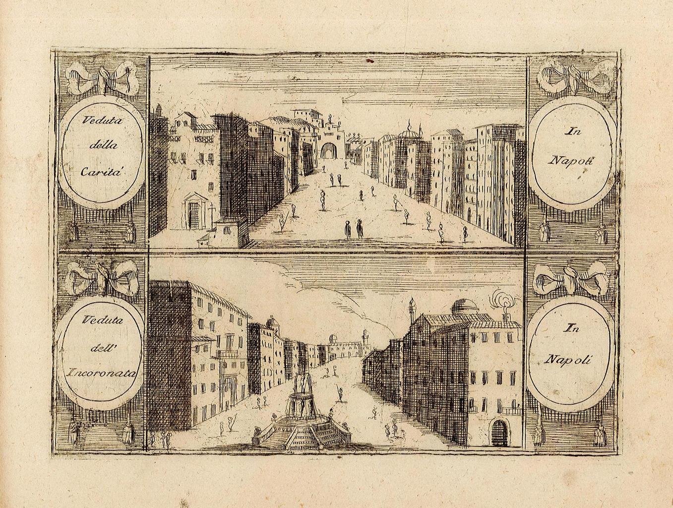 Rara veduta con due scorci della città di Napoli inserita nell’opera “Teatro della Guerra. - Regno di Napol” del cosmografo veneziano Vincenzo Maria Coronelli edita a Venezia nel 1707-1708