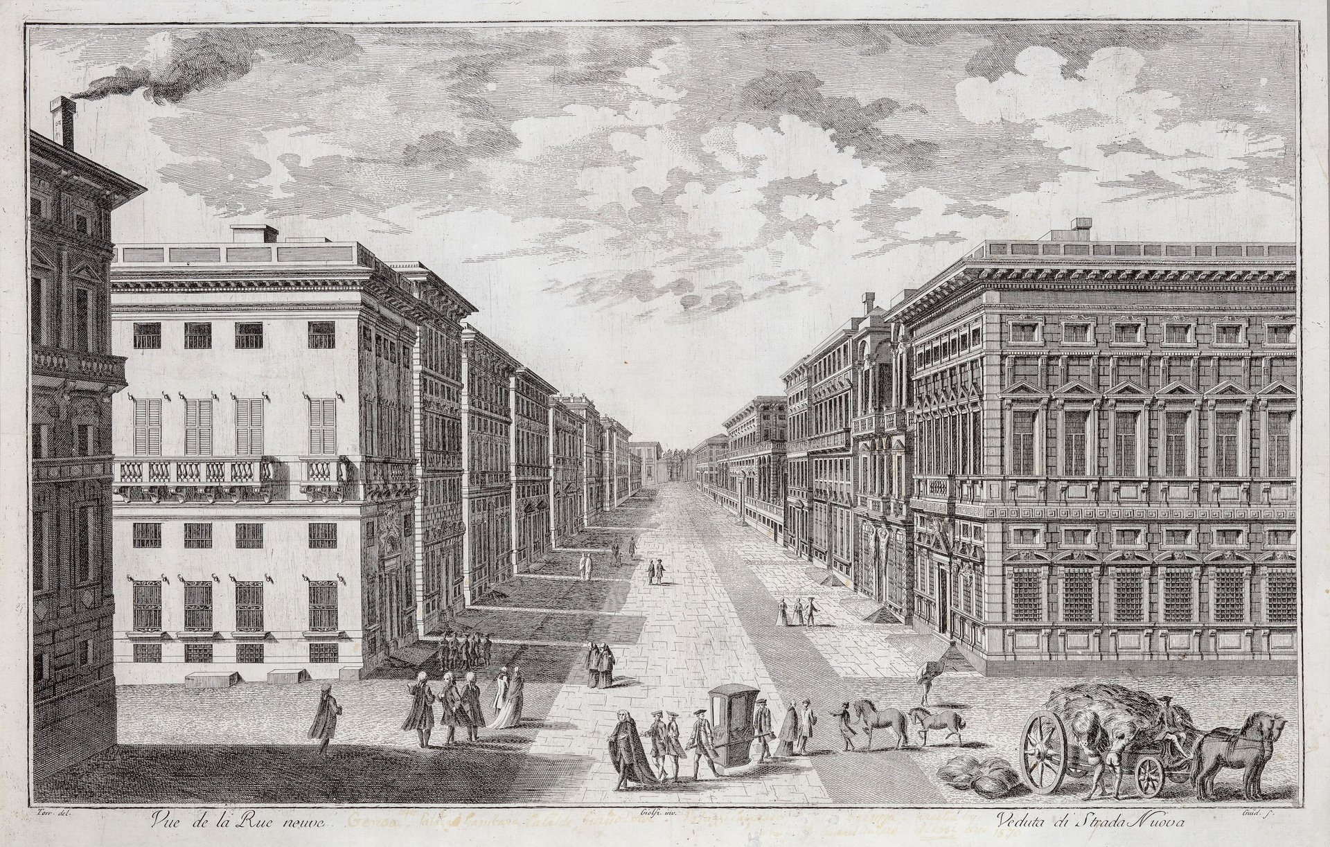 Incisione in rame, mm 413x655, firmata in basso “Giolfi Inv.” al centro, “Torr. del.” a sinistra e “Guid s.” a destra. Bella veduta prospettica della principale ed elegante arteria cittadina, facente parte della serie Raccolta di diverse vedute della città di Genova e delle principali sue parti e fabbriche che Giolfi pubblicò nel 1769, dedicandola a Giuseppe Doria e a suo padre Giovanni Francesco morto prematuramente, composta da venti acqueforti eseguite in collaborazione con i toscani Giuseppe Torricelli per la stesura preparatoria, Gian Lorenzo Guidotti (autore di alcune tavole per la seconda edizione dell’Encyclopédie) per l’incisione, oltre a Giuseppe Riviera per l’esecuzione dei disegni delle due tavole di San Pier d’Arena e della Villa Doria a Fassolo e ai Chiesa Tessera, autori di quattro lastre. Il G. scelse e diresse i collaboratori limitandone talvolta l’invenzione e il disegno (Poleggi, 1986, pp. 17 s.). Oggi si conosce una sola copia rilegata dell’intera raccolta di stampe. Buon esemplare con qualche forellino restaurato, margini laterali rifilati alla battuta del rame.